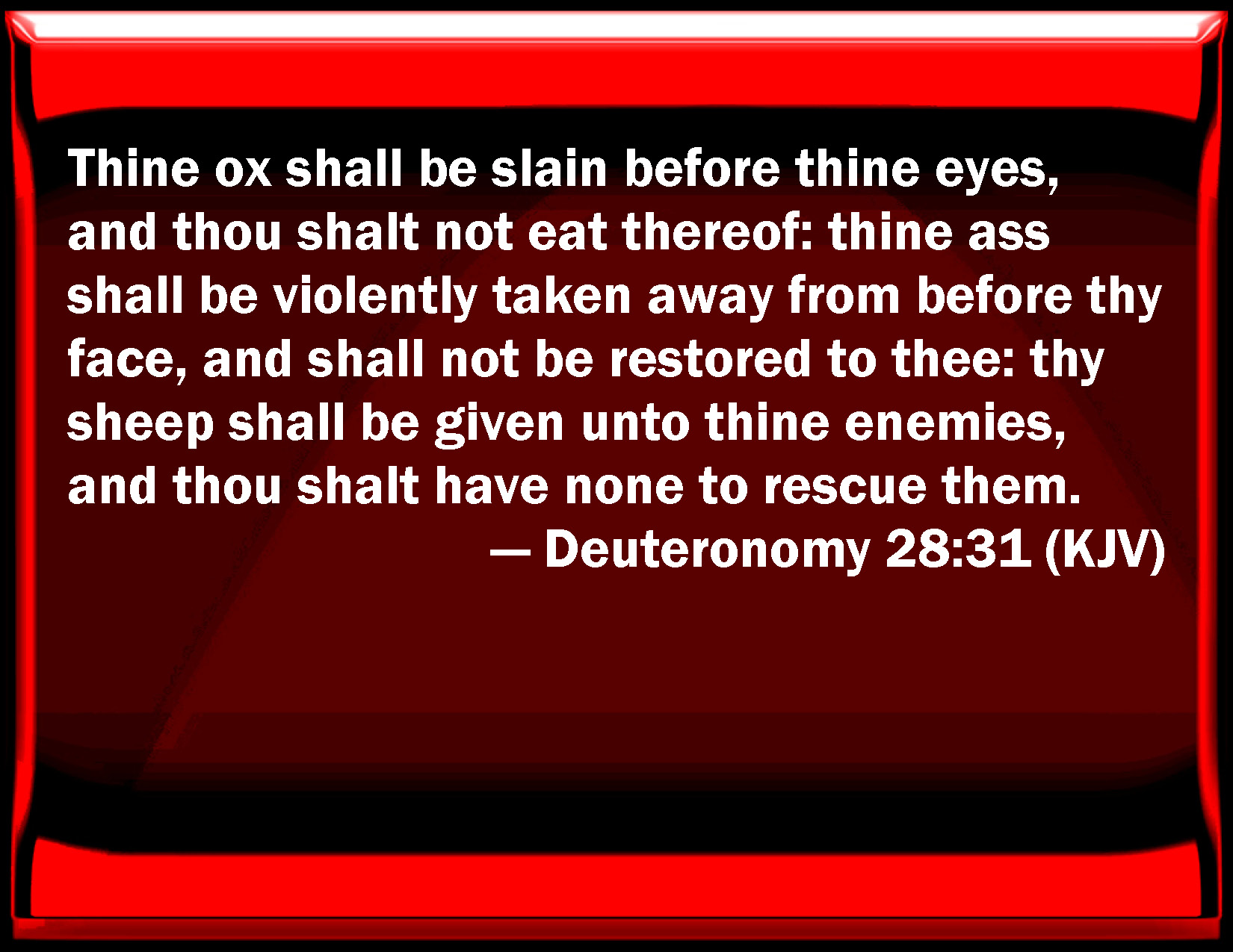 Bible Verse Slide Deuteronomy 28:31 Your ox shall be slain before your eyes, and you shall not eat thereof: your ass shall be violently taken away from before your face, and shall not be restored to you: your sheep shall be given to your enemies, and you shall have none to rescue them. KJV: Thine ox shall be slain before thine eyes, and thou shalt not eat thereof: thine ass shall be violently taken away from before thy face, and shall not be restored to thee: thy sheep shall be given unto thine enemies, and thou shalt have none to rescue them. DRB: May thy ox be slain before thee, and thou not eat thereof. May thy ass be taken away in thy sight, and not restored to thee. May thy sheep be given to thy enemies, and may there be none to help thee. DBT: Thine ox shall be slaughtered before thine eyes, and thou shalt not eat thereof; thine ass shall be snatched away from before thy face, and shall not return to thee; thy sheep shall be given unto thine enemies, and thou shalt have none to recover them. ERV: Thine ox shall be slain before thine eyes, and thou shalt not eat thereof: thine ass shall be violently taken away from before thy face, and shall not be restored to thee: thy sheep shall be given unto thine enemies, and thou shalt have none to save thee. WBT: Thy ox shall be slain before thy eyes, and thou shalt not eat of it: thy ass shall be violently taken away from before thy face, and shall not be restored to thee: thy sheep shall be given to thy enemies, and thou shalt have none to rescue them. WEB: Your ox shall be slain before your eyes, and you shall not eat of it: your donkey shall be violently taken away from before your face, and shall not be restored to you: your sheep shall be given to your enemies, and you shall have none to save you. YLT: thine ox is slaughtered before thine eyes, and thou dost not eat of it; thine ass is taken violently away from before thee, and it is not given back to thee; thy sheep are given to thine enemies, and there is no saviour for thee.Links Deuteronomy 28:31 NIV • Deuteronomy 28:31 NLT • Deuteronomy 28:31 ESV • Deuteronomy 28:31 NASB • Deuteronomy 28:31 KJV • Deuteronomy 28:31 Interlinear • Deuteronomy 28:31 Commentaries • Deuteronomy 28:31 Parallel Texts • Deuteronomy 28:31 Bible Apps • Deuteronomy 28:31 Parallel • Bible Hub |