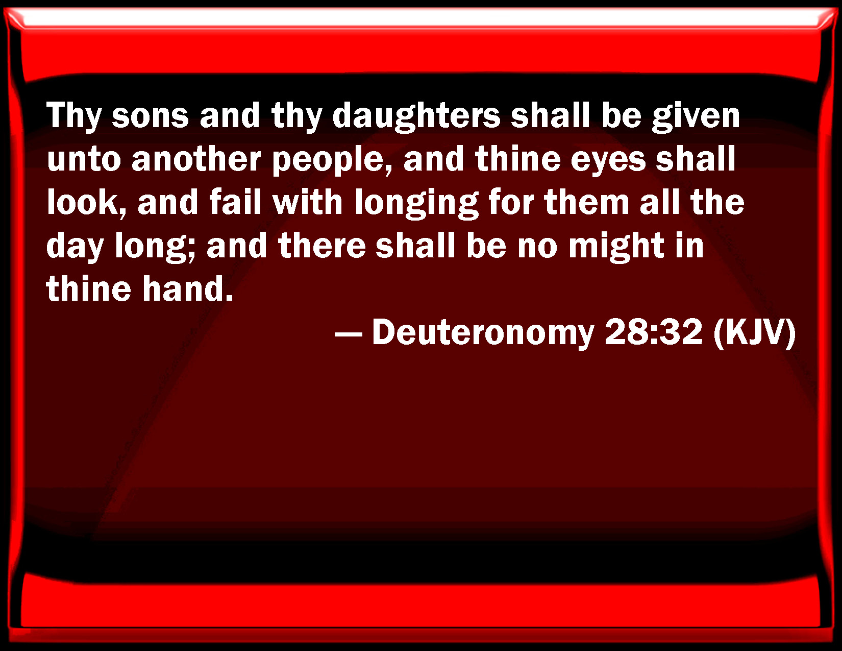 Bible Verse Slide Deuteronomy 28:32 Your sons and your daughters shall be given to another people, and your eyes shall look, and fail with longing for them all the day long; and there shall be no might in your hand. KJV: Thy sons and thy daughters shall be given unto another people, and thine eyes shall look, and fail with longing for them all the day long: and there shall be no might in thine hand. DRB: May thy sons and thy daughters be given to another people, thy eyes looking on, and languishing at the sight of them all the day, and may there be no strength in thy hand. DBT: Thy sons and thy daughters shall be given unto another people, and thine eyes shall look, and languish for them all the day long; and there shall be no power in thy hand to help it. ERV: Thy sons and thy daughters shall be given unto another people, and thine eyes shall look, and fail with longing for them all the day: and there shall be nought in the power of thine hand. WBT: Thy sons and thy daughters shall be given to another people, and thy eyes shall look, and fail with longing for them all the day long: and there shall be no might in thy hand. WEB: Your sons and your daughters shall be given to another people; and your eyes shall look, and fail with longing for them all the day: and there shall be nothing in the power of your hand. YLT: Thy sons and thy daughters are given to another people, and thine eyes are looking and consuming for them all the day, and thy hand is not to God!Links Deuteronomy 28:32 NIV • Deuteronomy 28:32 NLT • Deuteronomy 28:32 ESV • Deuteronomy 28:32 NASB • Deuteronomy 28:32 KJV • Deuteronomy 28:32 Interlinear • Deuteronomy 28:32 Commentaries • Deuteronomy 28:32 Parallel Texts • Deuteronomy 28:32 Bible Apps • Deuteronomy 28:32 Parallel • Bible Hub |