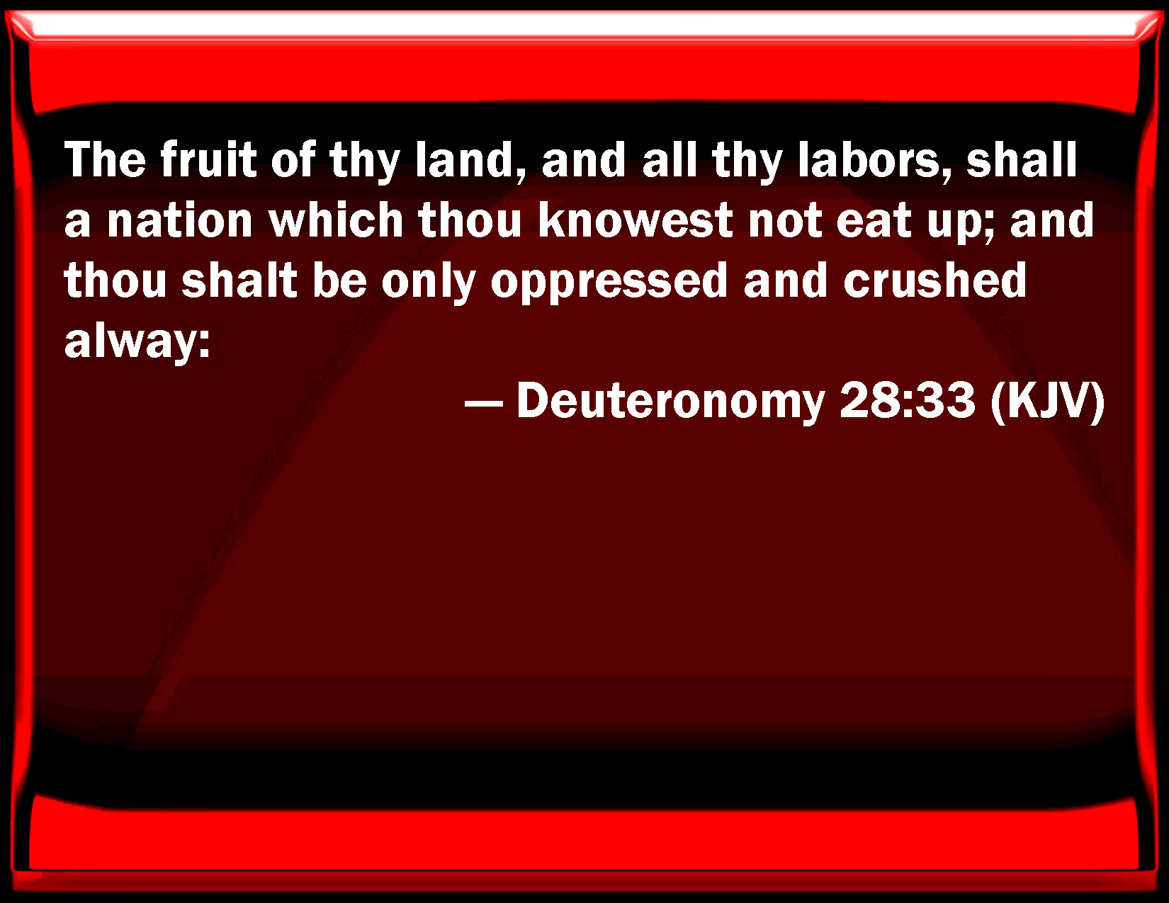 Bible Verse Slide Deuteronomy 28:33 The fruit of your land, and all your labors, shall a nation which you know not eat up; and you shall be only oppressed and crushed always: KJV: The fruit of thy land, and all thy labours, shall a nation which thou knowest not eat up; and thou shalt be only oppressed and crushed alway: DRB: May a people which thou knowest not, eat the fruits of thy land, and all thy labours: and mayst thou always suffer oppression, and be crushed at all times. DBT: The fruit of thy ground and all thy labour, shall a people that thou knowest not eat up; and thou shalt be only oppressed and crushed continually. ERV: The fruit of thy ground, and all thy labours, shall a nation which thou knowest not eat up; and thou shalt be only oppressed and crushed alway: WBT: The fruit of thy land, and all thy labors, shall be eaten by a nation which thou knowest not: and thou shalt be only oppressed and crushed always: WEB: The fruit of your ground, and all your labors, shall a nation which you don't know eat up; and you shall be only oppressed and crushed always; YLT: The fruit of thy ground, and all thy labour, eat up doth a people whom thou hast not known; and thou hast been only oppressed and bruised all the days;Links Deuteronomy 28:33 NIV • Deuteronomy 28:33 NLT • Deuteronomy 28:33 ESV • Deuteronomy 28:33 NASB • Deuteronomy 28:33 KJV • Deuteronomy 28:33 Interlinear • Deuteronomy 28:33 Commentaries • Deuteronomy 28:33 Parallel Texts • Deuteronomy 28:33 Bible Apps • Deuteronomy 28:33 Parallel • Bible Hub |