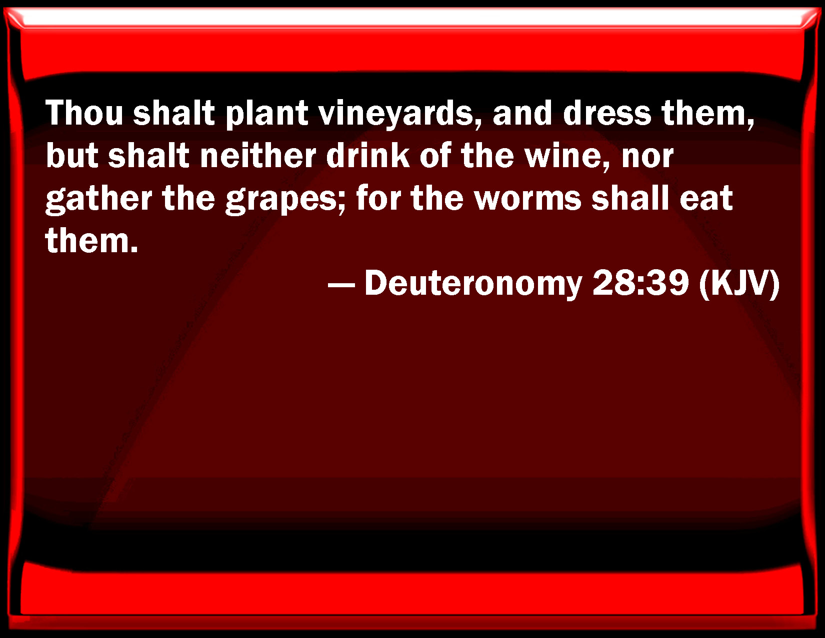 Bible Verse Slide Deuteronomy 28:39 You shall plant vineyards, and dress them, but shall neither drink of the wine, nor gather the grapes; for the worms shall eat them. KJV: Thou shalt plant vineyards, and dress them, but shalt neither drink of the wine, nor gather the grapes; for the worms shall eat them. DRB: Thou shalt plant a vineyard, and dig it, and shalt not drink the wine, nor gather any thing thereof: because it shall be wasted with worms. DBT: Thou shalt plant and till vineyards, but shalt drink no wine, nor gather the fruit; for the worms shall eat it. ERV: Thou shalt plant vineyards and dress them, but thou shalt neither drink of the wine, nor gather the grapes; for the worm shall eat them. WBT: Thou shalt plant vineyards and dress them, but shalt neither drink of the wine, nor gather the grapes: for the worm shall eat them. WEB: You shall plant vineyards and dress them, but you shall neither drink of the wine, nor gather [the grapes]; for the worm shall eat them. YLT: vineyards thou dost plant, and hast laboured, and wine thou dost not drink nor gather, for the worm doth consume it;Links Deuteronomy 28:39 NIV • Deuteronomy 28:39 NLT • Deuteronomy 28:39 ESV • Deuteronomy 28:39 NASB • Deuteronomy 28:39 KJV • Deuteronomy 28:39 Interlinear • Deuteronomy 28:39 Commentaries • Deuteronomy 28:39 Parallel Texts • Deuteronomy 28:39 Bible Apps • Deuteronomy 28:39 Parallel • Bible Hub |