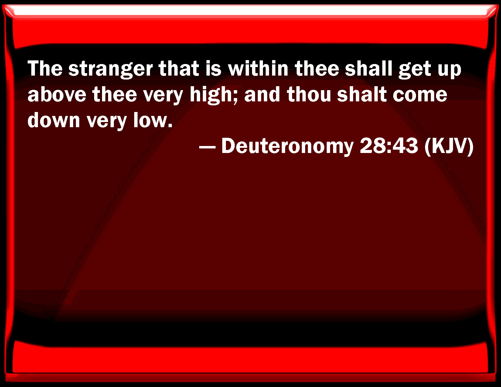 Deuteronomy 28:43 The stranger that is within you shall get up above you very high; and you shall come down very low.