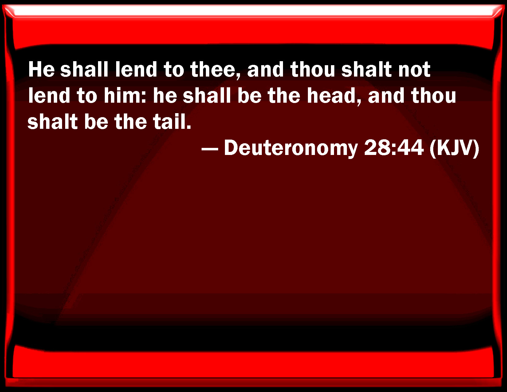 Bible Verse Slide Deuteronomy 28:44 He shall lend to you, and you shall not lend to him: he shall be the head, and you shall be the tail. KJV: He shall lend to thee, and thou shalt not lend to him: he shall be the head, and thou shalt be the tail. DRB: He shall lend to thee, and thou shalt not lend to him. He shall be as the head, and thou shalt be the tail. DBT: He shall lend to thee, but thou shalt not lend to him: he shall be the head, and thou shalt be the tail. ERV: He shall lend to thee, and thou shalt not lend to him: he shall be the head, and thou shalt be the tail. WBT: He shall lend to thee, and thou shalt not lend to him: he shall be the head, and thou shalt be the tail. WEB: He shall lend to you, and you shall not lend to him: he shall be the head, and you shall be the tail. YLT: he doth lend to thee, and thou dost not lend to him; he is for head, and thou art for tail.Links Deuteronomy 28:44 NIV • Deuteronomy 28:44 NLT • Deuteronomy 28:44 ESV • Deuteronomy 28:44 NASB • Deuteronomy 28:44 KJV • Deuteronomy 28:44 Interlinear • Deuteronomy 28:44 Commentaries • Deuteronomy 28:44 Parallel Texts • Deuteronomy 28:44 Bible Apps • Deuteronomy 28:44 Parallel • Bible Hub |