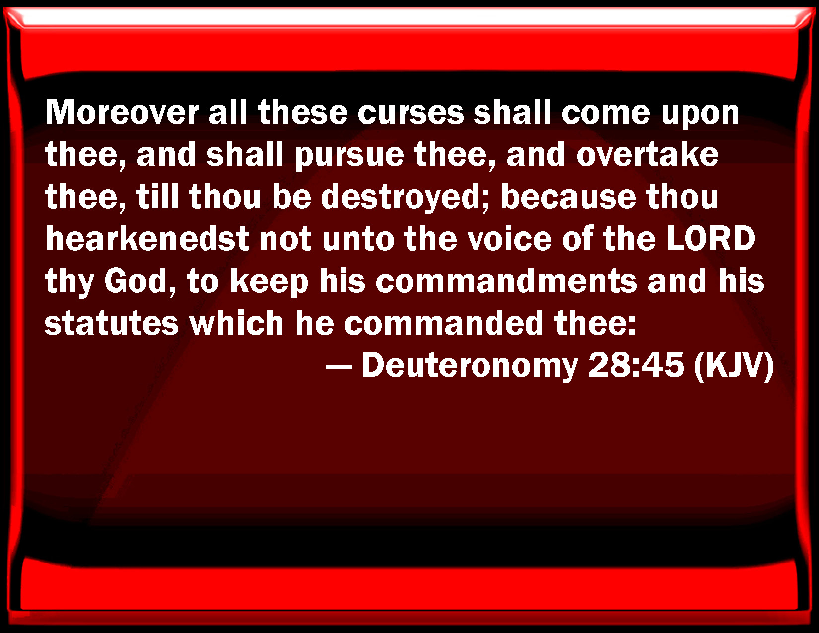 Bible Verse Slide Deuteronomy 28:45 Moreover all these curses shall come on you, and shall pursue you, and overtake you, till you be destroyed; because you listened not to the voice of the LORD your God, to keep his commandments and his statutes which he commanded you: KJV: Moreover all these curses shall come upon thee, and shall pursue thee, and overtake thee, till thou be destroyed; because thou hearkenedst not unto the voice of the LORD thy God, to keep his commandments and his statutes which he commanded thee: DRB: And all these curses shall come upon thee, and shall pursue and overtake thee, till thou perish: because thou heardst not the voice of the Lord thy God, and didst not keep his commandments and ceremonies which he commanded thee. DBT: And all these curses shall come upon thee, and shall pursue thee, and overtake thee, until thou be destroyed; because thou hearkenedst not unto the voice of Jehovah thy God, to keep his commandments and his statutes which he commanded thee. ERV: And all these curses shall come upon thee, and shall pursue thee, and overtake thee, till thou be destroyed; because thou hearkenedst not unto the voice of the LORD thy God, to keep his commandments and his statutes which he commanded thee: WBT: Moreover, all these curses shall come upon thee, and shall pursue thee, and overtake thee, till thou art destroyed: because thou hearkenedst not to the voice of the LORD thy God, to keep his commandments and his statutes which he commanded thee: WEB: All these curses shall come on you, and shall pursue you, and overtake you, until you are destroyed; because you didn't listen to the voice of Yahweh your God, to keep his commandments and his statutes which he commanded you: YLT: 'And come upon thee have all these curses, and they have pursued thee, and overtaken thee, till thou art destroyed, because thou hast not hearkened to the voice of Jehovah thy God, to keep His commands, and His statutes, which he hath commanded thee;Links Deuteronomy 28:45 NIV • Deuteronomy 28:45 NLT • Deuteronomy 28:45 ESV • Deuteronomy 28:45 NASB • Deuteronomy 28:45 KJV • Deuteronomy 28:45 Interlinear • Deuteronomy 28:45 Commentaries • Deuteronomy 28:45 Parallel Texts • Deuteronomy 28:45 Bible Apps • Deuteronomy 28:45 Parallel • Bible Hub |