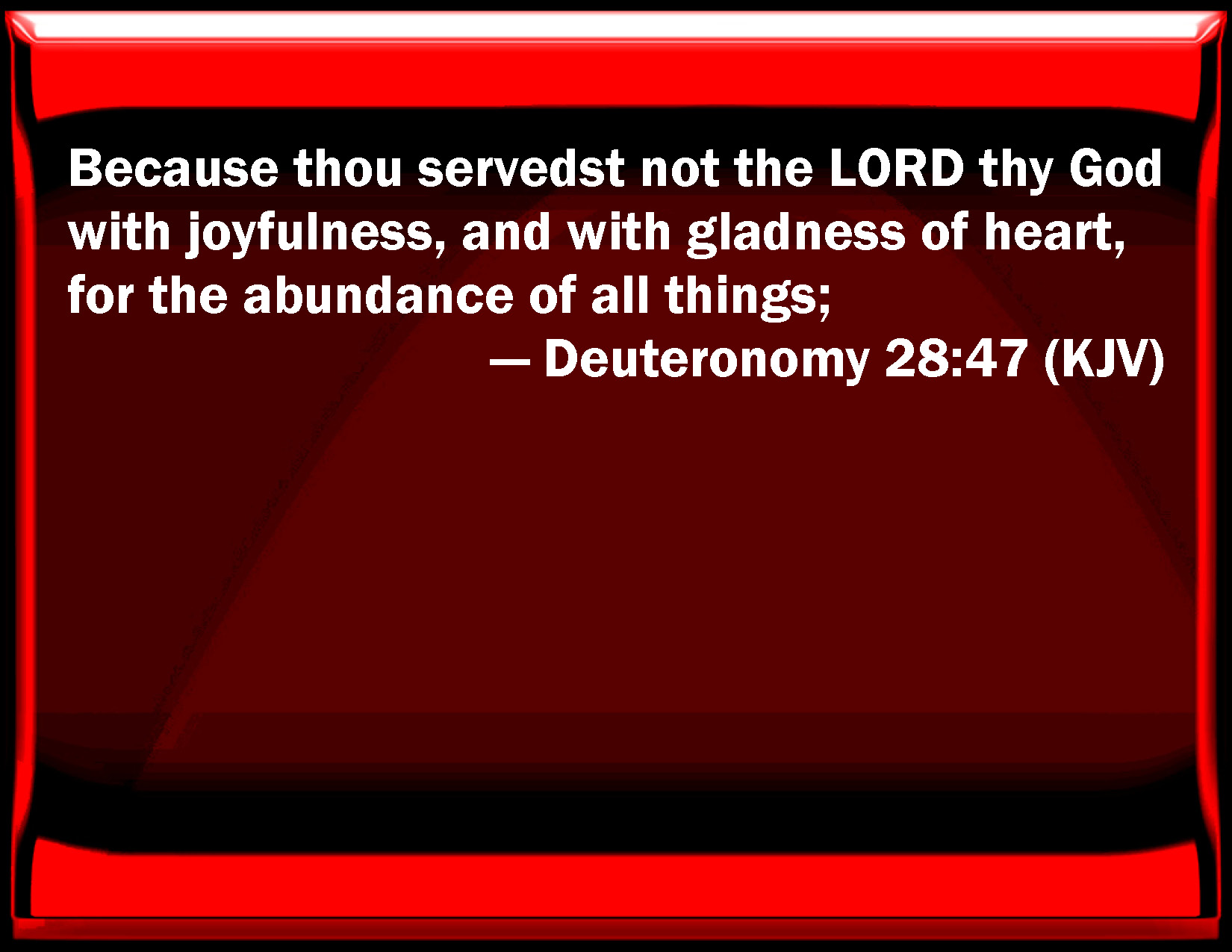 Bible Verse Slide Deuteronomy 28:47 Because you served not the LORD your God with joyfulness, and with gladness of heart, for the abundance of all things; KJV: Because thou servedst not the LORD thy God with joyfulness, and with gladness of heart, for the abundance of all things; DRB: Because thou didst not serve the Lord thy God with joy and gladness of heart, for the abundance of all things: DBT: Because thou servedst not Jehovah thy God with joyfulness, and with gladness of heart, for the abundance of everything, ERV: because thou servedst not the LORD thy God with joyfulness, and with gladness of heart, by reason of the abundance of all things: WBT: Because thou didst not serve the LORD thy God with joyfulness and with gladness of heart, for the abundance of all things: WEB: Because you didn't serve Yahweh your God with joyfulness, and with gladness of heart, by reason of the abundance of all things; YLT: Because that thou hast not served Jehovah thy God with joy, and with gladness of heart, because of the abundance of all things — Links Deuteronomy 28:47 NIV • Deuteronomy 28:47 NLT • Deuteronomy 28:47 ESV • Deuteronomy 28:47 NASB • Deuteronomy 28:47 KJV • Deuteronomy 28:47 Interlinear • Deuteronomy 28:47 Commentaries • Deuteronomy 28:47 Parallel Texts • Deuteronomy 28:47 Bible Apps • Deuteronomy 28:47 Parallel • Bible Hub |