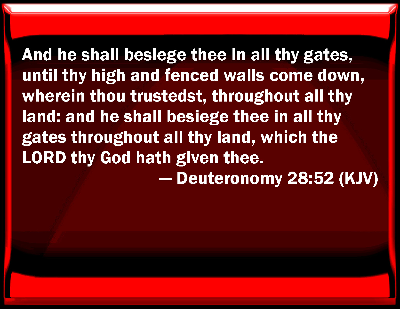Bible Verse Slide Deuteronomy 28:52 And he shall besiege you in all your gates, until your high and fenced walls come down, wherein you trusted, throughout all your land: and he shall besiege you in all your gates throughout all your land, which the LORD your God has given you. KJV: And he shall besiege thee in all thy gates, until thy high and fenced walls come down, wherein thou trustedst, throughout all thy land: and he shall besiege thee in all thy gates throughout all thy land, which the LORD thy God hath given thee. DRB: And consume thee in all thy cities, end thy strong and high walls be brought down, wherein thou trustedst in all thy land. Thou shalt be besieged within thy gates in all thy land which the Lord thy God will give thee: DBT: And he shall besiege thee in all thy gates, until thy high and strong walls wherein thou trustedst come down, throughout all thy land; and he shall besiege thee in all thy gates in all thy land, which Jehovah thy God hath given thee. ERV: And he shall besiege thee in all thy gates, until thy high and fenced walls come down, wherein thou trustedst, throughout all thy land: and he shall besiege thee in all thy gates throughout all thy land, which the LORD thy God hath given thee. WBT: And he shall besiege thee in all thy gates, until thy high and fortified walls come down, in which thou didst trust, throughout all thy land; and he shall besiege thee in all thy gates throughout all thy land which the LORD thy God hath given thee. WEB: They shall besiege you in all your gates, until your high and fortified walls come down, in which you trusted, throughout all your land; and they shall besiege you in all your gates throughout all your land, which Yahweh your God has given you. YLT: 'And it hath laid siege to thee in all thy gates, till thy walls come down, the high and the fenced ones in which thou art trusting, in all thy land; yea, it hath laid siege to thee in all thy gates, in all thy land, which Jehovah thy God hath given to thee;Links Deuteronomy 28:52 NIV • Deuteronomy 28:52 NLT • Deuteronomy 28:52 ESV • Deuteronomy 28:52 NASB • Deuteronomy 28:52 KJV • Deuteronomy 28:52 Interlinear • Deuteronomy 28:52 Commentaries • Deuteronomy 28:52 Parallel Texts • Deuteronomy 28:52 Bible Apps • Deuteronomy 28:52 Parallel • Bible Hub |