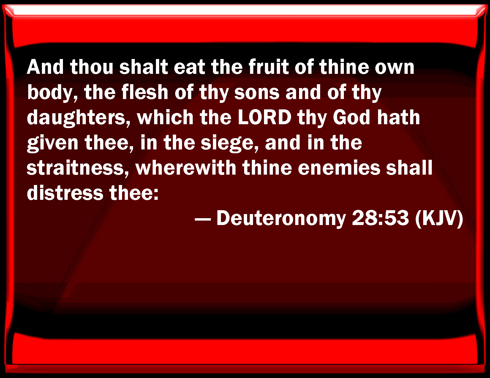 Bible Verse Slide Deuteronomy 28:53 And you shall eat the fruit of your own body, the flesh of your sons and of your daughters, which the LORD your God has given you, in the siege, and in the narrow place, with which your enemies shall distress you: KJV: And thou shalt eat the fruit of thine own body, the flesh of thy sons and of thy daughters, which the LORD thy God hath given thee, in the siege, and in the straitness, wherewith thine enemies shall distress thee: DRB: And thou shalt eat the fruit of thy womb, and the flesh of thy sons and of thy daughters, which the Lord thy God shall give thee, in the distress and extremity wherewith thy enemy shall oppress thee. DBT: And in the siege, and in the straitness, wherewith thine enemies shall distress thee, thou shalt eat the fruit of thine own body, the flesh of thy sons and of thy daughters whom Jehovah thy God hath given thee. ERV: And thou shalt eat the fruit of thine own body, the flesh of thy sons and of thy daughters which the LORD thy God hath given thee; in the siege and in the straitness, wherewith thine enemies shall straiten thee. WBT: And thou shalt eat the fruit of thy own body, the flesh of thy sons and of thy daughters which the LORD thy God hath given thee, in the siege and in the straitness with which thy enemies shall distress thee: WEB: You shall eat the fruit of your own body, the flesh of your sons and of your daughters, whom Yahweh your God has given you, in the siege and in the distress with which your enemies shall distress you. YLT: and thou hast eaten the fruit of thy body, flesh of thy sons and thy daughters (whom Jehovah thy God hath given to thee), in the siege, and in the straitness with which thine enemies do straiten thee.Links Deuteronomy 28:53 NIV • Deuteronomy 28:53 NLT • Deuteronomy 28:53 ESV • Deuteronomy 28:53 NASB • Deuteronomy 28:53 KJV • Deuteronomy 28:53 Interlinear • Deuteronomy 28:53 Commentaries • Deuteronomy 28:53 Parallel Texts • Deuteronomy 28:53 Bible Apps • Deuteronomy 28:53 Parallel • Bible Hub |