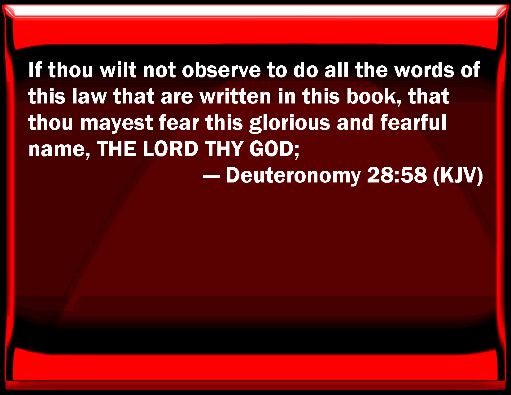 Bible Verse Slide Deuteronomy 28:58 If you will not observe to do all the words of this law that are written in this book, that you may fear this glorious and fearful name, THE LORD THY GOD; KJV: If thou wilt not observe to do all the words of this law that are written in this book, that thou mayest fear this glorious and fearful name, THE LORD THY GOD; DRB: If thou wilt not keep, and fulfil all the words of this law, that are written in this volume, and fear his glorious and terrible name: that is, The Lord thy God: DBT: If thou wilt not take heed to do all the words of this law that are written in this book, to fear this glorious and fearful name, JEHOVAH THY GOD; ERV: If thou wilt not observe to do all the words of this law that are written in this book, that thou mayest fear this glorious and fearful name, THE LORD THY GOD; WBT: If thou wilt not observe to do all the words of this law that are written in this book, that thou mayest fear this glorious and fearful name, THE LORD THY GOD; WEB: If you will not observe to do all the words of this law that are written in this book, that you may fear this glorious and fearful name, YAHWEH YOUR GOD; YLT: If thou dost not observe to do all the words of this law which are written in this book, to fear this honoured and fearful name — Jehovah thy God — Links Deuteronomy 28:58 NIV • Deuteronomy 28:58 NLT • Deuteronomy 28:58 ESV • Deuteronomy 28:58 NASB • Deuteronomy 28:58 KJV • Deuteronomy 28:58 Interlinear • Deuteronomy 28:58 Commentaries • Deuteronomy 28:58 Parallel Texts • Deuteronomy 28:58 Bible Apps • Deuteronomy 28:58 Parallel • Bible Hub |