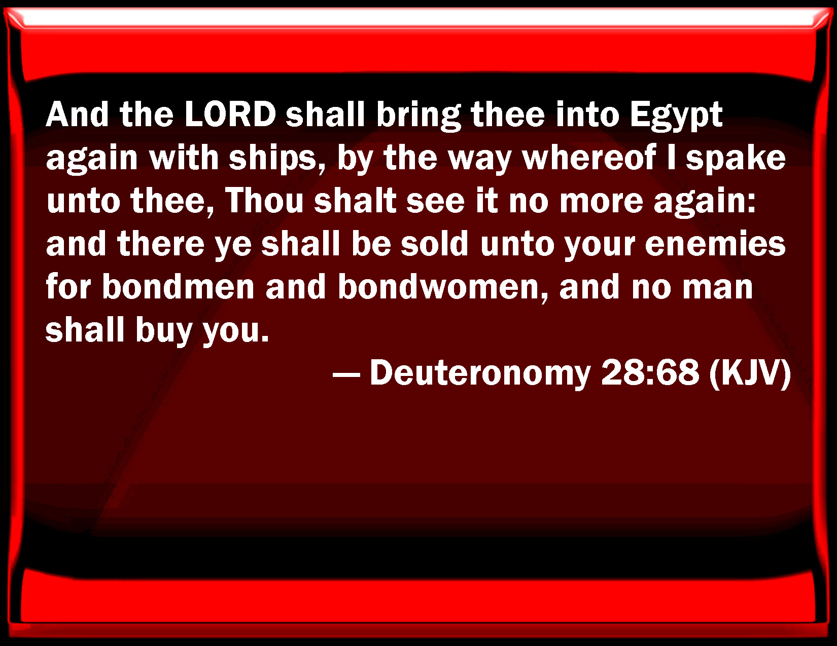 Bible Verse Slide Deuteronomy 28:68 And the LORD shall bring you into Egypt again with ships, by the way whereof I spoke to you, You shall see it no more again: and there you shall be sold to your enemies for slaves and bondwomen, and no man shall buy you. KJV: And the LORD shall bring thee into Egypt again with ships, by the way whereof I spake unto thee, Thou shalt see it no more again: and there ye shall be sold unto your enemies for bondmen and bondwomen, and no man shall buy you. DRB: The Lord shall bring thee again with ships into Egypt, by the way whereof he said to thee that thou shouldst see it no more. There shalt thou be set to sale to thy enemies for bondmen and bondwomen, and no man shall buy you. DBT: And Jehovah will bring thee into Egypt again with ships, by the way whereof I said unto thee, Thou shalt see it again no more; and there ye shall be sold unto your enemies for bondmen and bondwomen, and there shall be no man to buy you. ERV: And the LORD shall bring thee into Egypt again with ships, by the way whereof I said unto thee, Thou shalt see it no more again: and there ye shall sell yourselves unto your enemies for bondmen and for bondwomen, and no man shall buy you. WBT: And the LORD shall bring thee into Egypt again with ships, by the way of which I have said to thee, Thou shalt see it no more again: and there ye shall be sold to your enemies for bond-men and bond-women, and no man shall buy you. WEB: Yahweh will bring you into Egypt again with ships, by the way of which I said to you, You shall see it no more again: and there you shall sell yourselves to your enemies for bondservants and for bondmaids, and no man shall buy you. YLT: 'And Jehovah hath brought thee back to Egypt with ships, by a way of which I said to thee, Thou dost not add any more to see it, and ye have sold yourselves there to thine enemies, for men-servants and for maid-servants, and there is no buyer.'Links Deuteronomy 28:68 NIV • Deuteronomy 28:68 NLT • Deuteronomy 28:68 ESV • Deuteronomy 28:68 NASB • Deuteronomy 28:68 KJV • Deuteronomy 28:68 Interlinear • Deuteronomy 28:68 Commentaries • Deuteronomy 28:68 Parallel Texts • Deuteronomy 28:68 Bible Apps • Deuteronomy 28:68 Parallel • Bible Hub |