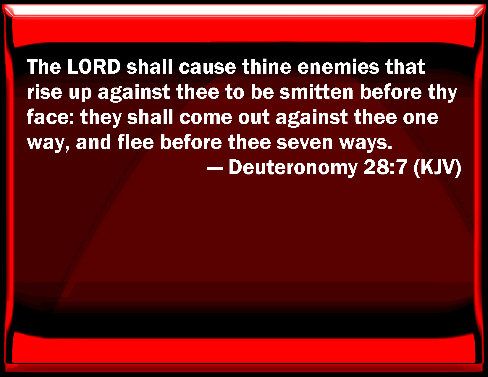 Bible Verse Slide Deuteronomy 28:7 The LORD shall cause your enemies that rise up against you to be smitten before your face: they shall come out against you one way, and flee before you seven ways. KJV: The LORD shall cause thine enemies that rise up against thee to be smitten before thy face: they shall come out against thee one way, and flee before thee seven ways. DRB: The Lord shall cause thy enemies, that rise up against thee, to fall down before thy face: one way shall they come out against thee, and seven ways shall they flee before thee. DBT: Jehovah will give up, smitten before thee, thine enemies that rise up against thee; they shall come out against thee one way, and by seven ways shall they flee before thee. ERV: The LORD shall cause thine enemies that rise up against thee to be smitten before thee: they shall come out against thee one way, and shall flee before thee seven ways. WBT: The LORD shall cause thy enemies that rise up against thee to be smitten before thy face: they shall come out against thee one way, and flee before thee seven ways. WEB: Yahweh will cause your enemies who rise up against you to be struck before you. They will come out against you one way, and will flee before you seven ways. YLT: Jehovah giveth thine enemies, who are rising up against thee — smitten before thy face; in one way they come out unto thee, and in seven ways they flee before thee.Links Deuteronomy 28:7 NIV • Deuteronomy 28:7 NLT • Deuteronomy 28:7 ESV • Deuteronomy 28:7 NASB • Deuteronomy 28:7 KJV • Deuteronomy 28:7 Interlinear • Deuteronomy 28:7 Commentaries • Deuteronomy 28:7 Parallel Texts • Deuteronomy 28:7 Bible Apps • Deuteronomy 28:7 Parallel • Bible Hub |
