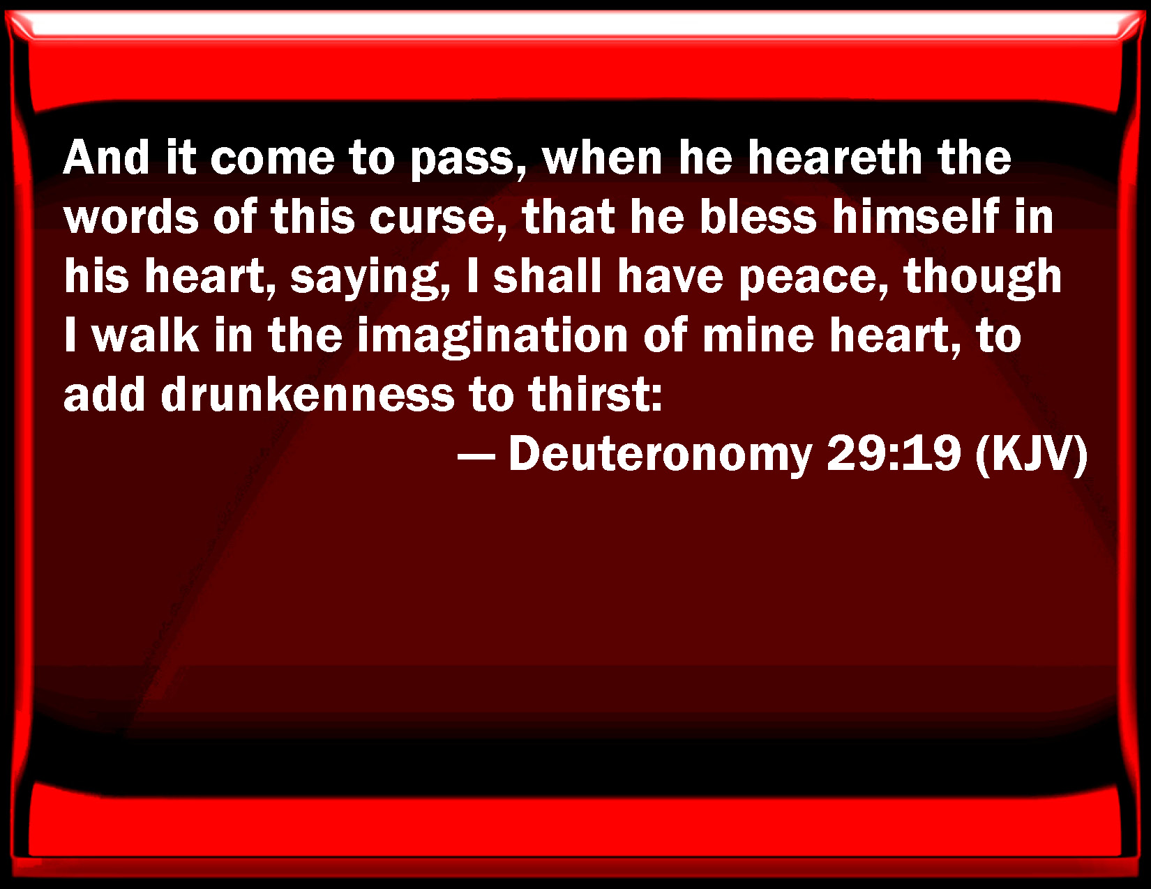 Bible Verse Slide Deuteronomy 29:19 And it come to pass, when he hears the words of this curse, that he bless himself in his heart, saying, I shall have peace, though I walk in the imagination of my heart, to add drunkenness to thirst: KJV: And it come to pass, when he heareth the words of this curse, that he bless himself in his heart, saying, I shall have peace, though I walk in the imagination of mine heart, to add drunkenness to thirst: DRB: And when he shall hear the words of this oath, he should bless himself in his heart saying: I shall have peace, and will walk on in the naughtiness of my heart: and the drunken may consume the thirsty, DBT: and it come to pass, when he heareth the words of this curse, that he bless himself in his heart, saying, I shall have peace, though I walk in the stubbornness of my heart, to sweep away the drunken with the thirsty. ERV: and it come to pass, when he heareth the words of this curse, that he bless himself in his heart, saying, I shall have peace, though I walk in the stubbornness of mine heart, to destroy the moist with the dry: WBT: And it should come to pass, when he heareth the words of this curse, that he should bless himself in his heart, saying, I shall have peace, though I walk in the imagination of my heart, to add drunkenness to thirst: WEB: and it happen, when he hears the words of this curse, that he bless himself in his heart, saying, "I shall have peace, though I walk in the stubbornness of my heart, to destroy the moist with the dry." YLT: 'And it hath been, in his hearing the words of this oath, and he hath blessed himself in his heart, saying, I have peace, though in the stubbornness of my heart I go on, in order to end the fulness with the thirst.Links Deuteronomy 29:19 NIV • Deuteronomy 29:19 NLT • Deuteronomy 29:19 ESV • Deuteronomy 29:19 NASB • Deuteronomy 29:19 KJV • Deuteronomy 29:19 Interlinear • Deuteronomy 29:19 Commentaries • Deuteronomy 29:19 Parallel Texts • Deuteronomy 29:19 Bible Apps • Deuteronomy 29:19 Parallel • Bible Hub |