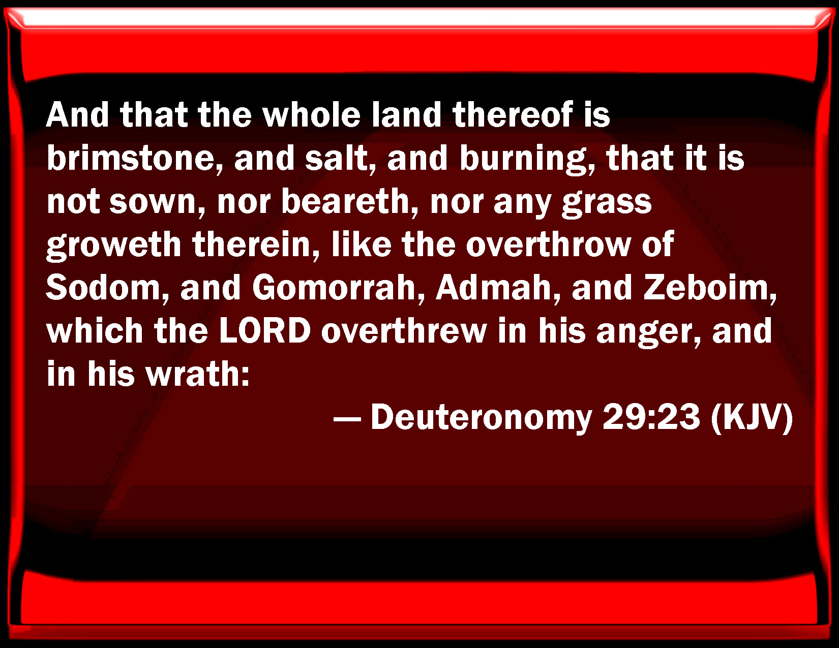 Bible Verse Slide Deuteronomy 29:23 And that the whole land thereof is brimstone, and salt, and burning, that it is not sown, nor bears, nor any grass grows therein, like the overthrow of Sodom, and Gomorrah, Admah, and Zeboim, which the LORD overthrew in his anger, and in his wrath: KJV: And that the whole land thereof is brimstone, and salt, and burning, that it is not sown, nor beareth, nor any grass groweth therein, like the overthrow of Sodom, and Gomorrah, Admah, and Zeboim, which the LORD overthrew in his anger, and in his wrath: DRB: Burning it with brimstone, and the heat of salt, so that it cannot be sown any more, nor any green thing grow therein, after the example of the destruction of Sodom and Gomorrha, Adama and Seboim, which the Lord destroyed in his wrath and indignation: DBT: that the whole ground thereof is brimstone and salt, and burning, that it is not sown, nor beareth, and no grass groweth in it, like the overthrow of Sodom and Gomorrah, Admah and Zeboim, which Jehovah overthrew in his anger and in his fury: ERV: and that the whole land thereof is brimstone, and salt, and a burning, that it is not sown, nor beareth, nor any grass groweth therein, like the overthrow of Sodom and Gomorrah, Admah and Zeboiim, which the LORD overthrew in his anger, and in his wrath: WBT: And that the whole land of it is brimstone, and salt, and burning, that it is not sown, nor doth it bear, nor doth any grass grow in it, like the overthrow of Sodom, and Gomorrah, Admah, and Zeboim, which the LORD overthrew in his anger and in his wrath: WEB: [and that] the whole land of it is sulfur, and salt, [and] a burning, [that] it is not sown, nor bears, nor any grass grows therein, like the overthrow of Sodom and Gomorrah, Admah and Zeboiim, which Yahweh overthrew in his anger, and in his wrath: YLT: (with brimstone and salt is the whole land burnt, it is not sown, nor doth it shoot up, nor doth there go up on it any herb, like the overthrow of Sodom and Gomorrah, Admah and Zeboim, which Jehovah overturned in His anger, and in His fury,) — Links Deuteronomy 29:23 NIV • Deuteronomy 29:23 NLT • Deuteronomy 29:23 ESV • Deuteronomy 29:23 NASB • Deuteronomy 29:23 KJV • Deuteronomy 29:23 Interlinear • Deuteronomy 29:23 Commentaries • Deuteronomy 29:23 Parallel Texts • Deuteronomy 29:23 Bible Apps • Deuteronomy 29:23 Parallel • Bible Hub |