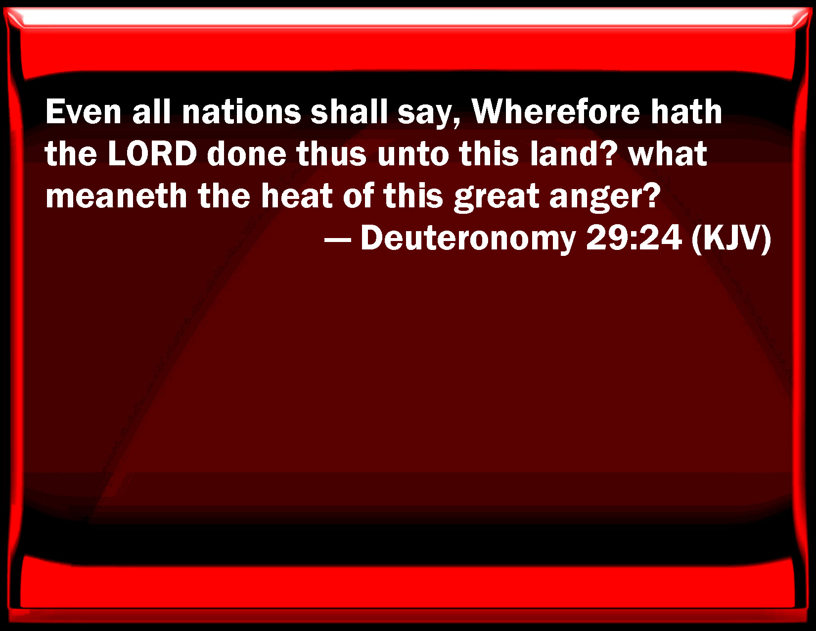 Deuteronomy 29:24 Even all nations shall say, Why has the LORD done thus to this land? what means the heat of this great anger?