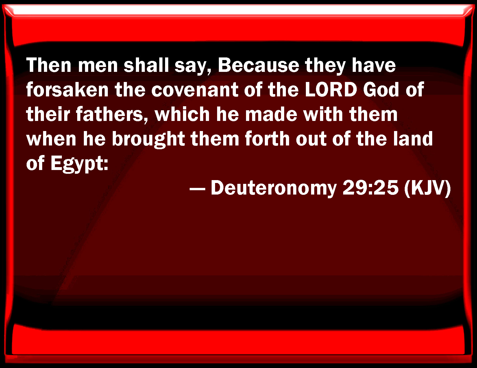 Bible Verse Slide Deuteronomy 29:25 Then men shall say, Because they have forsaken the covenant of the LORD God of their fathers, which he made with them when he brought them forth out of the land of Egypt: KJV: Then men shall say, Because they have forsaken the covenant of the LORD God of their fathers, which he made with them when he brought them forth out of the land of Egypt: DRB: And they shall answer: Because they forsook the covenant of the Lord, which he made with their fathers, when he brought them out of the land of Egypt: DBT: And men shall say, Because they have forsaken the covenant of Jehovah the God of their fathers, which he had made with them when he brought them forth out of the land of Egypt; ERV: Then men shall say, Because they forsook the covenant of the LORD, the God of their fathers, which he made with them when he brought them forth out of the land of Egypt; WBT: Then men shall say, Because they have forsaken the covenant of the LORD God of their fathers, which he made with them when he brought them forth from the land of Egypt: WEB: Then men shall say, "Because they forsook the covenant of Yahweh, the God of their fathers, which he made with them when he brought them forth out of the land of Egypt, YLT: 'And they have said, Because that they have forsaken the covenant of Jehovah, God of their fathers, which He made with them in His bringing them out of the land of Egypt,Links Deuteronomy 29:25 NIV • Deuteronomy 29:25 NLT • Deuteronomy 29:25 ESV • Deuteronomy 29:25 NASB • Deuteronomy 29:25 KJV • Deuteronomy 29:25 Interlinear • Deuteronomy 29:25 Commentaries • Deuteronomy 29:25 Parallel Texts • Deuteronomy 29:25 Bible Apps • Deuteronomy 29:25 Parallel • Bible Hub |