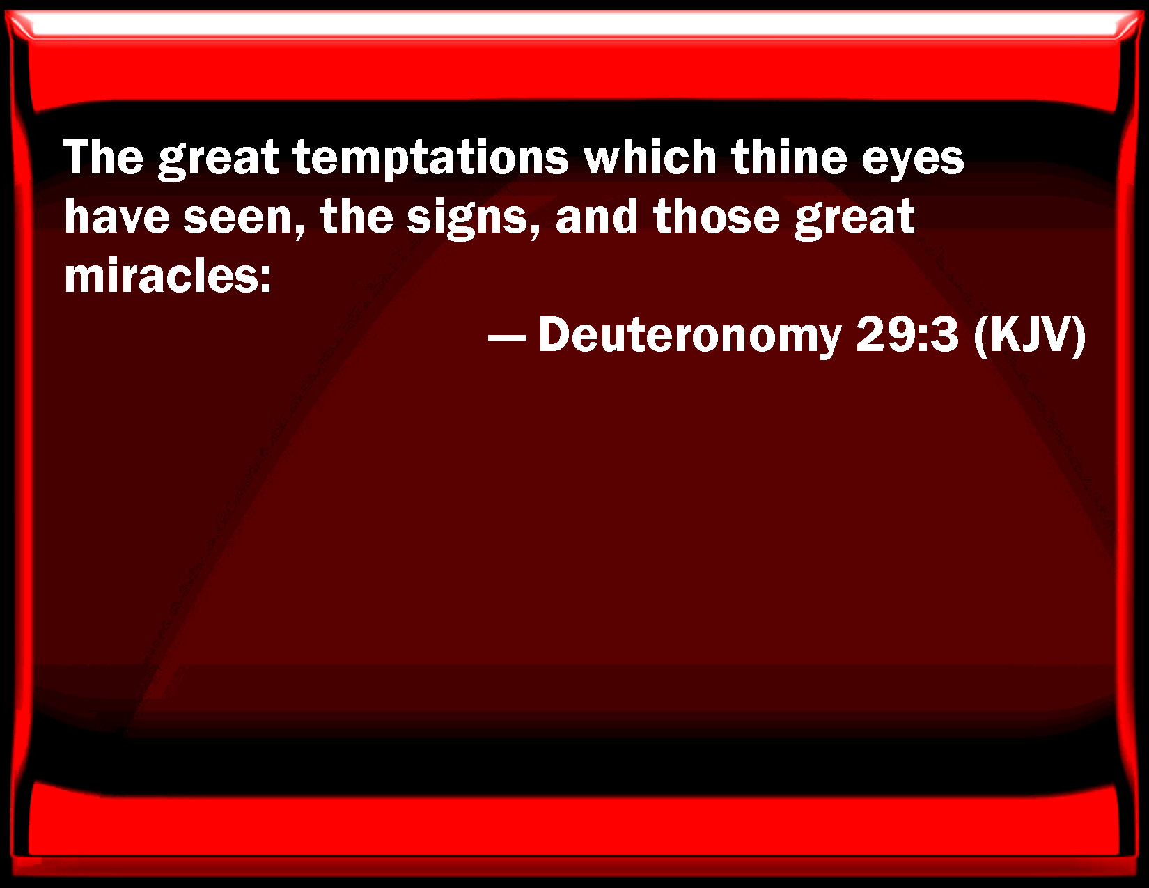 Bible Verse Slide Deuteronomy 29:3 The great temptations which your eyes have seen, the signs, and those great miracles: KJV: The great temptations which thine eyes have seen, the signs, and those great miracles: DRB: The great temptations, which thy eyes have seen, those mighty signs and wonders, DBT: the great trials that thine eyes have seen, those great signs and wonders. ERV: the great temptations which thine eyes saw, the signs, and those great wonders: WBT: The great temptations which thy eyes have seen, the signs, and those great miracles: WEB: the great trials which your eyes saw, the signs, and those great wonders: YLT: the great trials which thine eyes have seen, the signs, and those great wonders;Links Deuteronomy 29:3 NIV • Deuteronomy 29:3 NLT • Deuteronomy 29:3 ESV • Deuteronomy 29:3 NASB • Deuteronomy 29:3 KJV • Deuteronomy 29:3 Interlinear • Deuteronomy 29:3 Commentaries • Deuteronomy 29:3 Parallel Texts • Deuteronomy 29:3 Bible Apps • Deuteronomy 29:3 Parallel • Bible Hub |