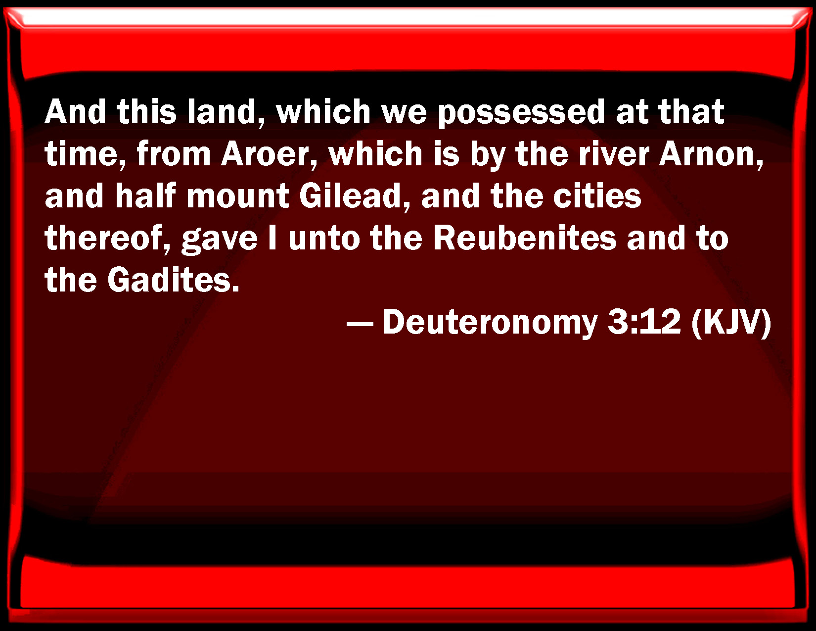 Bible Verse Slide Deuteronomy 3:12 And this land, which we possessed at that time, from Aroer, which is by the river Arnon, and half mount Gilead, and the cities thereof, gave I to the Reubenites and to the Gadites. KJV: And this land, which we possessed at that time, from Aroer, which is by the river Arnon, and half mount Gilead, and the cities thereof, gave I unto the Reubenites and to the Gadites. DRB: And we possessed the land at that time from Aroer, which is upon the bank of the torrent Amen, unto the half of mount Galaad: and I gave the cities thereof to Ruben and Gad. DBT: And this land we took in possession at that time. From Aroer, which is by the river Arnon, and the half of mount Gilead, and its cities, I gave to the Reubenites and to the Gadites; ERV: And this land we took in possession at that time: from Aroer, which is by the valley of Arnon, and half the hill country of Gilead, and the cities thereof, gave I unto the Reubenites and to the Gadites: WBT: And this land, which we possessed at that time, from Aroer, which is by the river Arnon, and half mount Gilead, and its cities, I gave to the Reubenites and to the Gadites. WEB: This land we took in possession at that time: from Aroer, which is by the valley of the Arnon, and half the hill country of Gilead, and its cities, gave I to the Reubenites and to the Gadites: YLT: And this land we have possessed, at that time; from Aroer, which is by the brook Arnon, and the half of mount Gilead, and its cities, I have given to the Reubenite, and to the Gadite;Links Deuteronomy 3:12 NIV • Deuteronomy 3:12 NLT • Deuteronomy 3:12 ESV • Deuteronomy 3:12 NASB • Deuteronomy 3:12 KJV • Deuteronomy 3:12 Interlinear • Deuteronomy 3:12 Commentaries • Deuteronomy 3:12 Parallel Texts • Deuteronomy 3:12 Bible Apps • Deuteronomy 3:12 Parallel • Bible Hub |