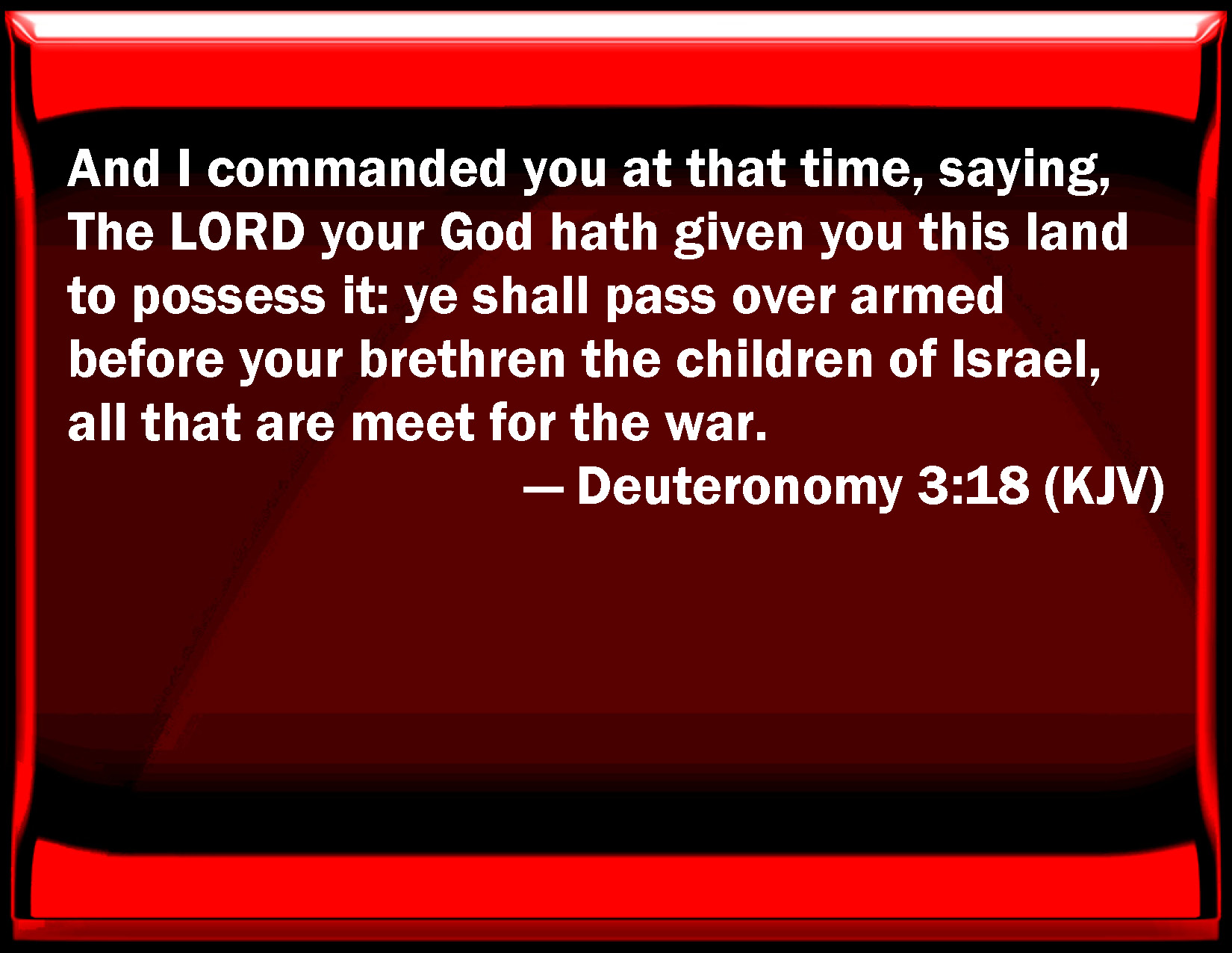 Bible Verse Slide Deuteronomy 3:18 And I commanded you at that time, saying, The LORD your God has given you this land to possess it: you shall pass over armed before your brothers the children of Israel, all that are meet for the war. KJV: And I commanded you at that time, saying, The LORD your God hath given you this land to possess it: ye shall pass over armed before your brethren the children of Israel, all that are meet for the war. DRB: And I commanded you at that time, saying: The Lord your God giveth you this land for an inheritance, go ye well appointed before your brethren the children of Israel, all the strong men of you, DBT: And I commanded you at that time, saying, Jehovah your God hath given you this land to take possession of it: ye shall pass over armed before your brethren the children of Israel, all who are combatants. ERV: And I commanded you at that time, saying, The LORD your God hath given you this land to possess it: ye shall pass over armed before your brethren the children of Israel, all the men of valour. WBT: And I commanded you at that time, saying, The LORD your God hath given you this land to possess it; ye shall pass over armed before your brethren the children of Israel, all that are meet for the war. WEB: I commanded you at that time, saying, "Yahweh your God has given you this land to possess it: you shall pass over armed before your brothers the children of Israel, all the men of valor. YLT: 'And I command you, at that time, saying, Jehovah your God hath given to you this land to possess it; armed ye pass over before your brethren the sons of Israel, all the sons of might.Links Deuteronomy 3:18 NIV • Deuteronomy 3:18 NLT • Deuteronomy 3:18 ESV • Deuteronomy 3:18 NASB • Deuteronomy 3:18 KJV • Deuteronomy 3:18 Interlinear • Deuteronomy 3:18 Commentaries • Deuteronomy 3:18 Parallel Texts • Deuteronomy 3:18 Bible Apps • Deuteronomy 3:18 Parallel • Bible Hub |