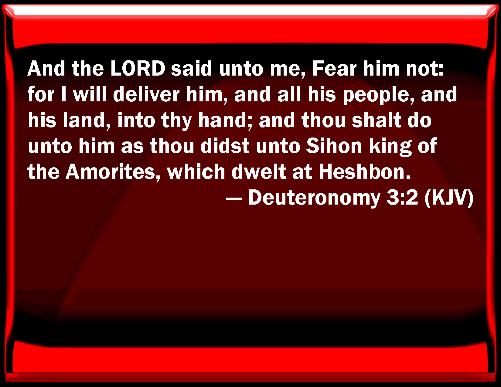 Bible Verse Slide Deuteronomy 3:2 And the LORD said to me, Fear him not: for I will deliver him, and all his people, and his land, into your hand; and you shall do to him as you did to Sihon king of the Amorites, which dwelled at Heshbon. KJV: And the LORD said unto me, Fear him not: for I will deliver him, and all his people, and his land, into thy hand; and thou shalt do unto him as thou didst unto Sihon king of the Amorites, which dwelt at Heshbon. DRB: And the Lord said to me: Fear him not: because he is delivered into thy hand, with all his people and his land: and thou shalt do to him as thou hast done to Sehon king of the Amorrhites, that dwelt in Hesebon. DBT: And Jehovah said to me, Fear him not; for into thy hand have I given him, and all his people, and his land; and thou shalt do unto him as thou didst unto Sihon the king of the Amorites, who dwelt at Heshbon. ERV: And the LORD said unto me, Fear him not: for I have delivered him, and all his people, and his land, into thy hand; and thou shalt do unto him as thou didst unto Sihon king of the Amorites, which dwelt at Heshbon. WBT: And the LORD said to me, Fear him not: for I will deliver him, and all his people, and his land, into thy hand; and thou shalt do to him as thou didst to Sihon king of the Amorites, who dwelt at Heshbon. WEB: Yahweh said to me, "Don't fear him; for I have delivered him, and all his people, and his land, into your hand; and you shall do to him as you did to Sihon king of the Amorites, who lived at Heshbon." YLT: 'And Jehovah saith unto me, Fear him not, for into thy hand I have given him, and all his people, and his land, and thou hast done to him as thou hast done to Sihon king of the Amorite who is dwelling in Heshbon.Links Deuteronomy 3:2 NIV • Deuteronomy 3:2 NLT • Deuteronomy 3:2 ESV • Deuteronomy 3:2 NASB • Deuteronomy 3:2 KJV • Deuteronomy 3:2 Interlinear • Deuteronomy 3:2 Commentaries • Deuteronomy 3:2 Parallel Texts • Deuteronomy 3:2 Bible Apps • Deuteronomy 3:2 Parallel • Bible Hub |