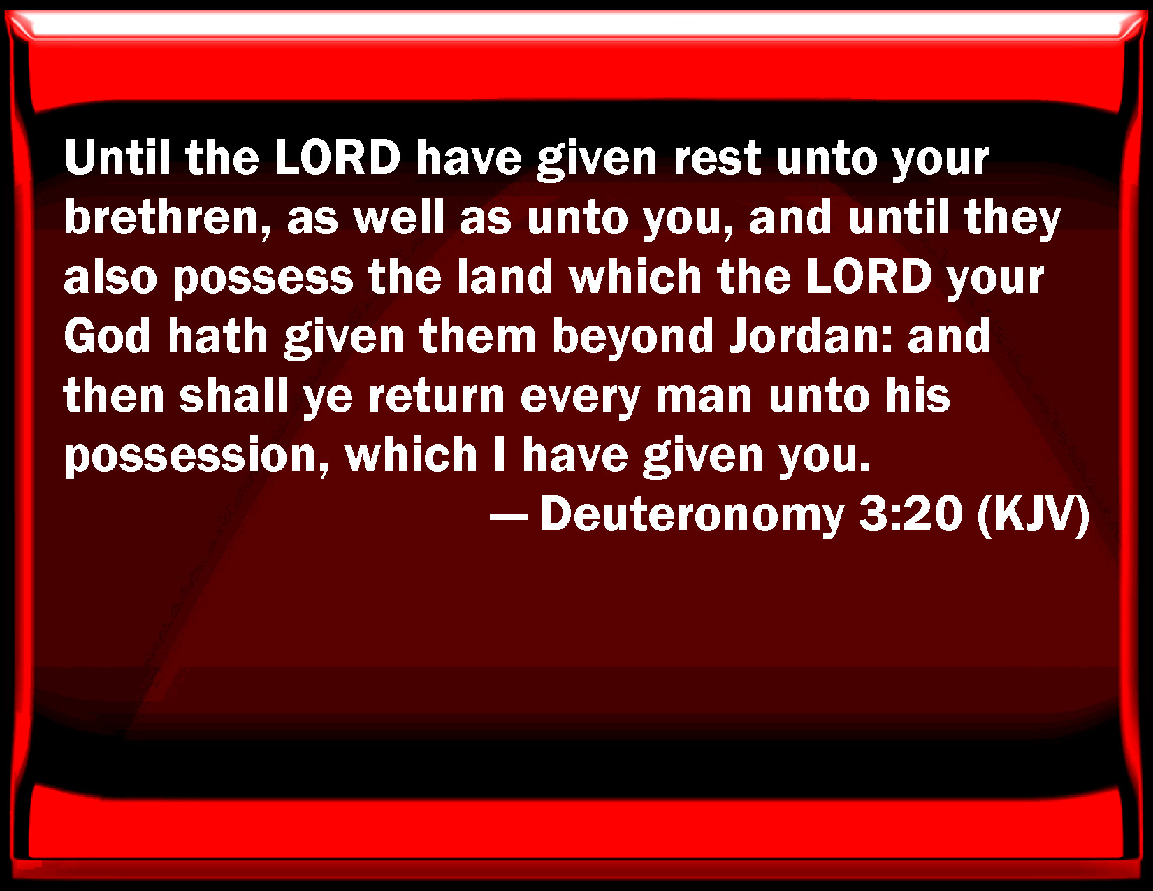 Bible Verse Slide Deuteronomy 3:20 Until the LORD have given rest to your brothers, as well as to you, and until they also possess the land which the LORD your God has given them beyond Jordan: and then shall you return every man to his possession, which I have given you. KJV: Until the LORD have given rest unto your brethren, as well as unto you, and until they also possess the land which the LORD your God hath given them beyond Jordan: and then shall ye return every man unto his possession, which I have given you. DRB: Until the Lord give rest to your brethren, as he hath given to you: and they also possess the land, which he will give them beyond the Jordan: then shall every man return to his possession, which I have given you. DBT: until Jehovah give rest to your brethren, as well as to you, and they also take possession of the land that Jehovah your God giveth them beyond the Jordan; then shall ye return, each man to his possession, which I have given you. ERV: until the LORD give rest unto your brethren, as unto you, and they also possess the land which the LORD your God giveth them beyond Jordan: then shall ye return every man unto his possession, which I have given you. WBT: Until the LORD shall have given rest to your brethren, as well as to you, and until they also possess the land which the LORD your God hath given them beyond Jordan: and then shall ye return every man to his possession which I have given you. WEB: until Yahweh gives rest to your brothers, as to you, and they also possess the land which Yahweh your God gives them beyond the Jordan: then you shall return every man to his possession, which I have given you." YLT: till that Jehovah give rest to your brethren like yourselves, and they also have possessed the land which Jehovah your God is giving to them beyond the Jordan, then ye have turned back each to his possession, which I have given to you.Links Deuteronomy 3:20 NIV • Deuteronomy 3:20 NLT • Deuteronomy 3:20 ESV • Deuteronomy 3:20 NASB • Deuteronomy 3:20 KJV • Deuteronomy 3:20 Interlinear • Deuteronomy 3:20 Commentaries • Deuteronomy 3:20 Parallel Texts • Deuteronomy 3:20 Bible Apps • Deuteronomy 3:20 Parallel • Bible Hub |