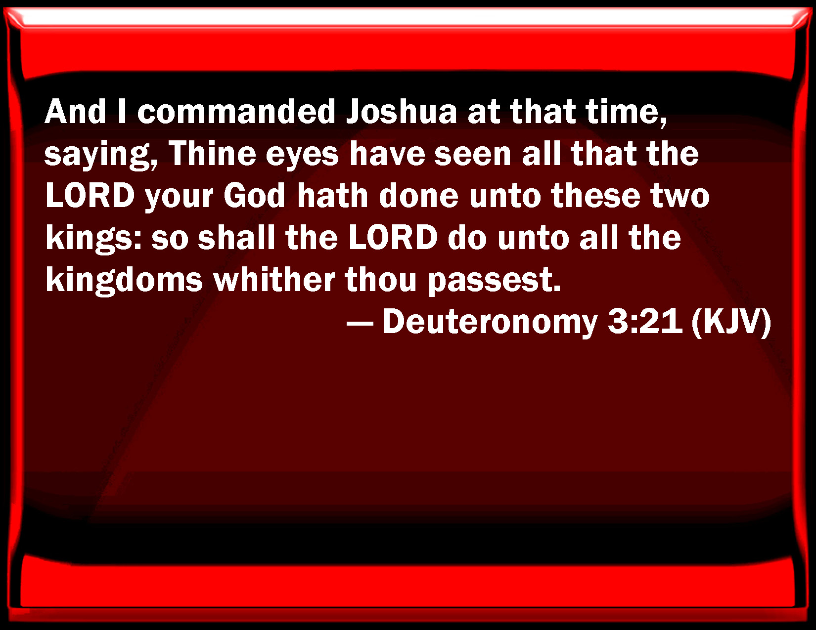 Bible Verse Slide Deuteronomy 3:21 And I commanded Joshua at that time, saying, Your eyes have seen all that the LORD your God has done to these two kings: so shall the LORD do to all the kingdoms where you pass. KJV: And I commanded Joshua at that time, saying, Thine eyes have seen all that the LORD your God hath done unto these two kings: so shall the LORD do unto all the kingdoms whither thou passest. DRB: I commanded Josue also at that time, saying: Thy eyes have seen what the Lord your God hath done to these two kings: so will he do to all the king- dome to which thou shalt pass. DBT: And I commanded Joshua at that time, saying, Thine eyes have seen all that Jehovah your God hath done to these two kings: so will Jehovah do to all the kingdoms to which thou shalt go. ERV: And I commanded Joshua at that time, saying, Thine eyes have seen all that the LORD your God hath done unto these two kings: so shall the LORD do unto all the kingdoms whither thou goest over. WBT: And I commanded Joshua at that time, saying, Thy eyes have seen all that the LORD your God hath done to these two kings: so shall the LORD do to all the kingdoms whither thou passest. WEB: I commanded Joshua at that time, saying, "Your eyes have seen all that Yahweh your God has done to these two kings: so shall Yahweh do to all the kingdoms where you go over. YLT: And Jehoshua I have commanded at that time, saying, Thine eyes are seeing all that which Jehovah your God hath done to these two kings — so doth Jehovah to all the kingdoms whither thou are passing over;Links Deuteronomy 3:21 NIV • Deuteronomy 3:21 NLT • Deuteronomy 3:21 ESV • Deuteronomy 3:21 NASB • Deuteronomy 3:21 KJV • Deuteronomy 3:21 Interlinear • Deuteronomy 3:21 Commentaries • Deuteronomy 3:21 Parallel Texts • Deuteronomy 3:21 Bible Apps • Deuteronomy 3:21 Parallel • Bible Hub |