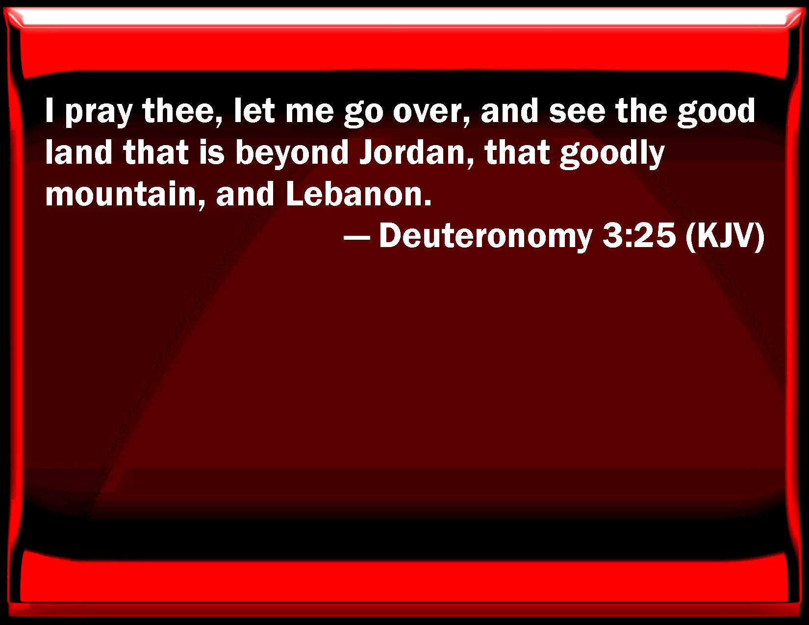 Bible Verse Slide Deuteronomy 3:25 I pray you, let me go over, and see the good land that is beyond Jordan, that goodly mountain, and Lebanon. KJV: I pray thee, let me go over, and see the good land that is beyond Jordan, that goodly mountain, and Lebanon. DRB: I will pass over therefore, and will see this excellent land beyond the Jordan, and this goodly mountain, and Libanus. DBT: Let me go over, I pray thee, and see the good land that is beyond the Jordan, that goodly mountain, and Lebanon. ERV: Let me go over, I pray thee, and see the good land that is beyond Jordan, that goodly mountain, and Lebanon. WBT: I pray thee, let me go over, and see the good land that is beyond Jordan, that goodly mountain, and Lebanon. WEB: Please let me go over and see the good land that is beyond the Jordan, that goodly mountain, and Lebanon." YLT: Let me pass over, I pray Thee, and see the good land which is beyond the Jordan, this good hill-country, and Lebanon.Links Deuteronomy 3:25 NIV • Deuteronomy 3:25 NLT • Deuteronomy 3:25 ESV • Deuteronomy 3:25 NASB • Deuteronomy 3:25 KJV • Deuteronomy 3:25 Interlinear • Deuteronomy 3:25 Commentaries • Deuteronomy 3:25 Parallel Texts • Deuteronomy 3:25 Bible Apps • Deuteronomy 3:25 Parallel • Bible Hub |