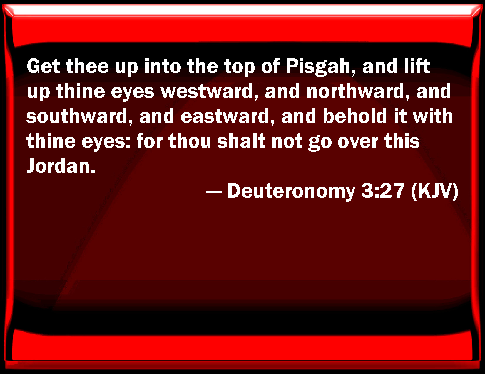 Bible Verse Slide Deuteronomy 3:27 Get you up into the top of Pisgah, and lift up your eyes westward, and northward, and southward, and eastward, and behold it with your eyes: for you shall not go over this Jordan. KJV: Get thee up into the top of Pisgah, and lift up thine eyes westward, and northward, and southward, and eastward, and behold it with thine eyes: for thou shalt not go over this Jordan. DRB: Go up to the top of Phasga, and cast thy eyes round about to the west, and to the north, and to the south, and to the east, and behold it, for thou shalt not pass this Jordan. DBT: Go up to the top of Pisgah, and lift up thine eyes westward, and northward, and southward, and eastward, and behold it with thine eyes; for thou shalt not go over this Jordan. ERV: Get thee up into the top of Pisgah, and lift up thine eyes westward, and northward, and southward, and eastward, and behold with thine eyes: for thou shalt not go over this Jordan. WBT: Ascend to the top of Pisgah, and lift up thy eyes westward, and northward, and southward, and eastward, and behold with thy eyes: for thou shalt not go over this Jordan. WEB: Go up to the top of Pisgah, and lift up your eyes westward, and northward, and southward, and eastward, and see with your eyes: for you shall not go over this Jordan. YLT: go up to the top of Pisgah, and lift up thine eyes westward, and northward, and southward, and eastward, and see with thine eyes — for thou dost not pass over this Jordan;Links Deuteronomy 3:27 NIV • Deuteronomy 3:27 NLT • Deuteronomy 3:27 ESV • Deuteronomy 3:27 NASB • Deuteronomy 3:27 KJV • Deuteronomy 3:27 Interlinear • Deuteronomy 3:27 Commentaries • Deuteronomy 3:27 Parallel Texts • Deuteronomy 3:27 Bible Apps • Deuteronomy 3:27 Parallel • Bible Hub |