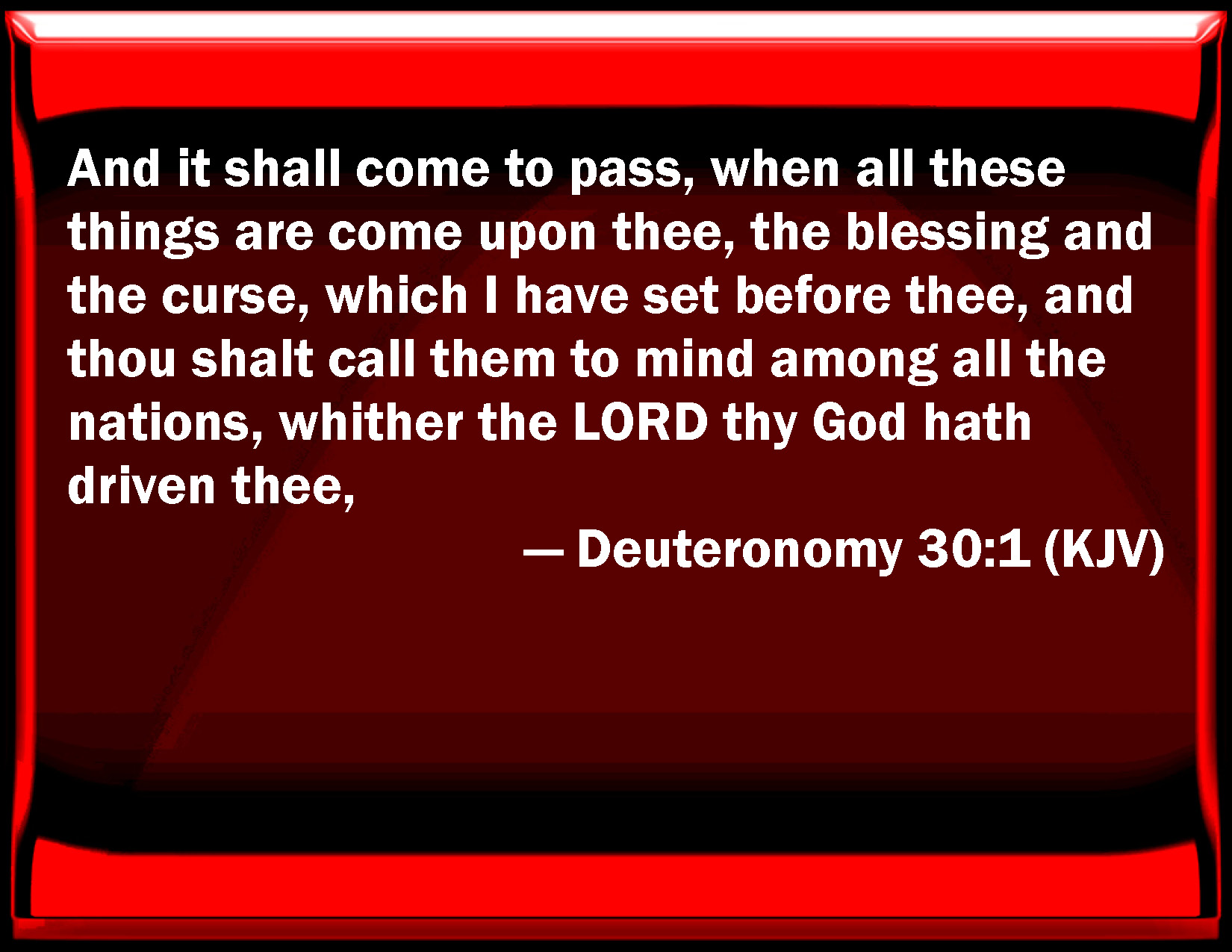Bible Verse Slide Deuteronomy 30:1 And it shall come to pass, when all these things are come on you, the blessing and the curse, which I have set before you, and you shall call them to mind among all the nations, where the LORD your God has driven you, KJV: And it shall come to pass, when all these things are come upon thee, the blessing and the curse, which I have set before thee, and thou shalt call them to mind among all the nations, whither the LORD thy God hath driven thee, DRB: Now when all these things shall be come upon thee, the blessing or the curse, which I have set forth before thee, and thou shalt be touched with repentance of thy heart among all the nations, into which the Lord thy God shall have scattered thee, DBT: And it shall come to pass, when all these things are come upon thee, the blessing and the curse, which I have set before thee, and thou shalt take them to heart among all the nations whither Jehovah thy God hath driven thee, ERV: And it shall come to pass, when all these things are come upon thee, the blessing and the curse, which I have set before thee, and thou shalt call them to mind among all the nations, whither the LORD thy God hath driven thee, WBT: And it shall come to pass, when all these things have come upon thee, the blessing and the curse, which I have set before thee, and thou shalt call them to mind among all the nations whither the LORD thy God hath driven thee, WEB: It shall happen, when all these things have come on you, the blessing and the curse, which I have set before you, and you shall call them to mind among all the nations, where Yahweh your God has driven you, YLT: And it hath been, when all these things come upon thee, the blessing and the reviling, which I have set before thee, and thou hast brought them back unto thy heart, among all the nations whither Jehovah thy God hath driven thee away,Links Deuteronomy 30:1 NIV • Deuteronomy 30:1 NLT • Deuteronomy 30:1 ESV • Deuteronomy 30:1 NASB • Deuteronomy 30:1 KJV • Deuteronomy 30:1 Interlinear • Deuteronomy 30:1 Commentaries • Deuteronomy 30:1 Parallel Texts • Deuteronomy 30:1 Bible Apps • Deuteronomy 30:1 Parallel • Bible Hub |