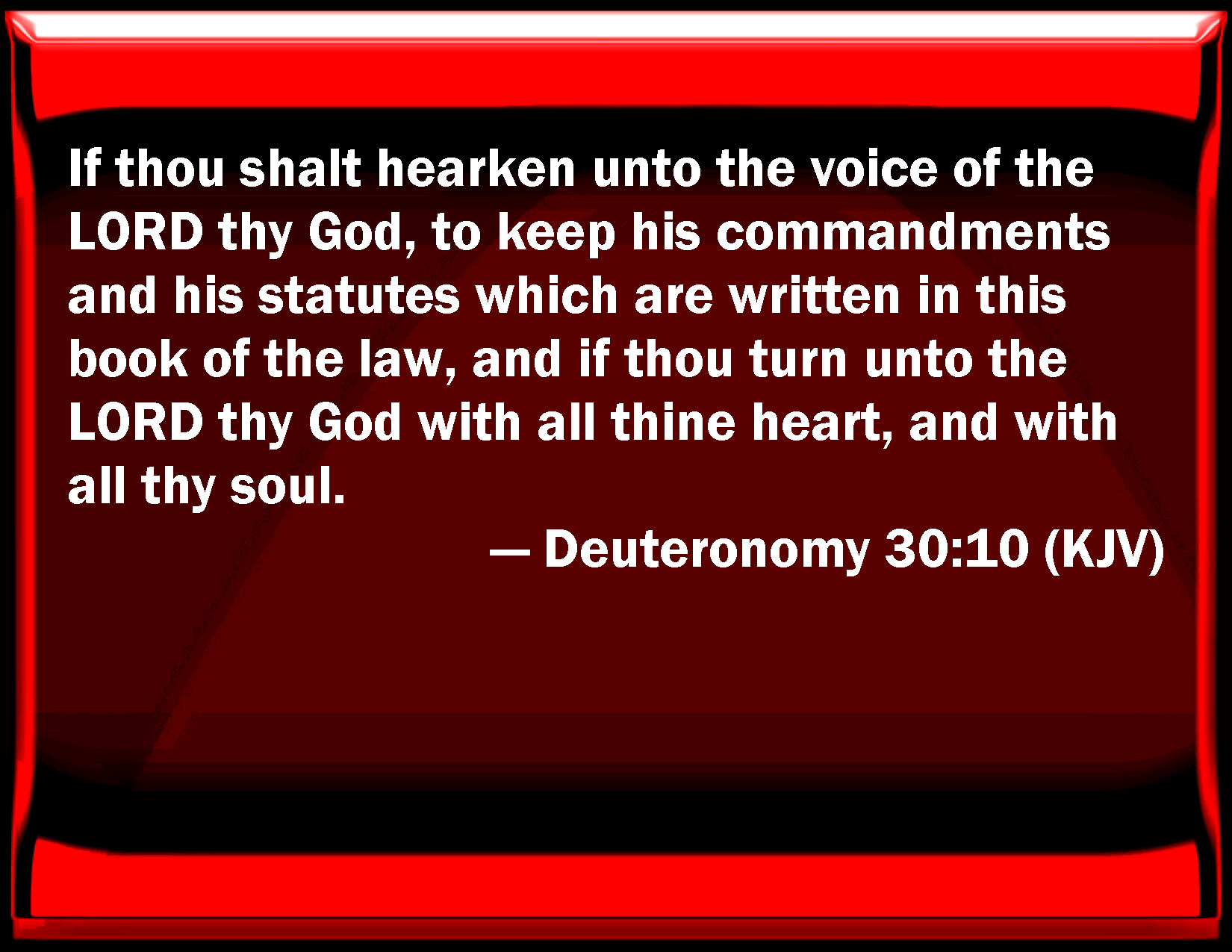 Bible Verse Slide Deuteronomy 30:10 If you shall listen to the voice of the LORD your God, to keep his commandments and his statutes which are written in this book of the law, and if you turn to the LORD your God with all your heart, and with all your soul. KJV: If thou shalt hearken unto the voice of the LORD thy God, to keep his commandments and his statutes which are written in this book of the law, and if thou turn unto the LORD thy God with all thine heart, and with all thy soul. DRB: Yet so if thou hear the voice of the Lord thy God, and keep his precepts and ceremonies, which are written in this law: and return to the Lord thy God with all thy heart, and with all thy soul. DBT: if thou shalt hearken unto the voice of Jehovah thy God, to keep his commandments and his statutes which are written in this book of the law; if thou turn to Jehovah thy God with all thy heart and with all thy soul. ERV: if thou shalt obey the voice of the LORD thy God, to keep his commandments and his statutes which are written in this book of the law; if thou turn unto the LORD thy God with all thine heart, and with all thy soul. WBT: If thou shalt hearken to the voice of the LORD thy God, to keep his commandments and his statutes which are written in this book of the law, and if thou shalt turn to the LORD thy God with all thy heart and with all thy soul. WEB: if you shall obey the voice of Yahweh your God, to keep his commandments and his statutes which are written in this book of the law; if you turn to Yahweh your God with all your heart, and with all your soul. YLT: for thou dost hearken to the voice of Jehovah thy God, to keep His commands, and His statutes, which are written in the book of this law, for thou turnest back unto Jehovah thy God, with all thy heart, and with all thy soul.Links Deuteronomy 30:10 NIV • Deuteronomy 30:10 NLT • Deuteronomy 30:10 ESV • Deuteronomy 30:10 NASB • Deuteronomy 30:10 KJV • Deuteronomy 30:10 Interlinear • Deuteronomy 30:10 Commentaries • Deuteronomy 30:10 Parallel Texts • Deuteronomy 30:10 Bible Apps • Deuteronomy 30:10 Parallel • Bible Hub |