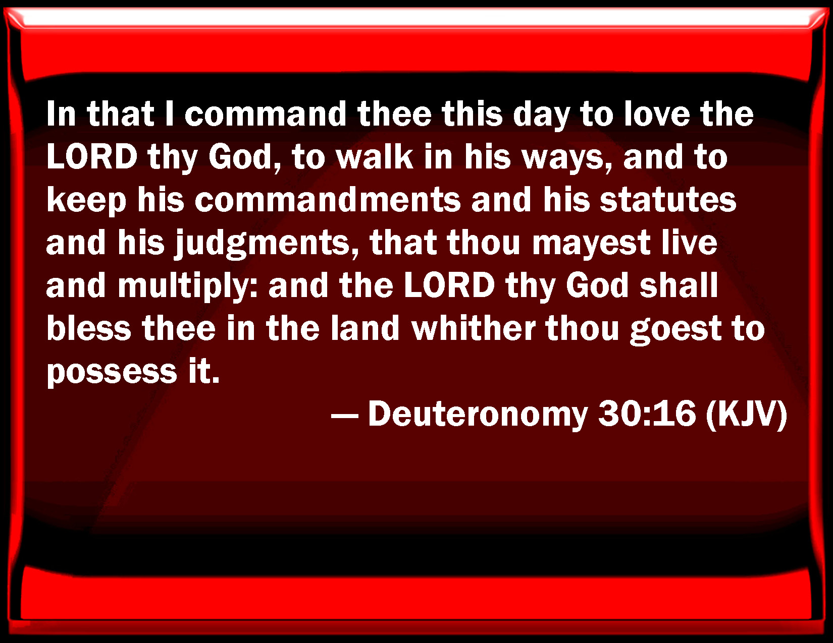 Bible Verse Slide Deuteronomy 30:16 In that I command you this day to love the LORD your God, to walk in his ways, and to keep his commandments and his statutes and his judgments, that you may live and multiply: and the LORD your God shall bless you in the land where you go to possess it. KJV: In that I command thee this day to love the LORD thy God, to walk in his ways, and to keep his commandments and his statutes and his judgments, that thou mayest live and multiply: and the LORD thy God shall bless thee in the land whither thou goest to possess it. DRB: That thou mayst love the Lord thy God, and walk in his ways, and keep his commandments and ceremonies and judgments, and thou mayst live, and he may multiply thee, and bless thee in the land, which thou shalt go in to possess. DBT: in that I command thee this day to love Jehovah thy God, to walk in his ways, and to keep his commandments and his statutes and his ordinances, that thou mayest live and multiply, and that Jehovah thy God may bless thee in the land whither thou goest to possess it. ERV: in that I command thee this day to love the LORD thy God, to walk in his ways, and to keep his commandments and his statutes and his judgments, that thou mayest live and multiply, and that the LORD thy God may bless thee in the land whither thou goest in to possess it. WBT: In that I command thee this day to love the LORD thy God, to walk in his ways, and to keep his commandments, and his statutes, and his judgments, that thou mayest live and multiply: and the LORD thy God shall bless thee in the land whither thou goest to possess it. WEB: in that I command you this day to love Yahweh your God, to walk in his ways, and to keep his commandments and his statutes and his ordinances, that you may live and multiply, and that Yahweh your God may bless you in the land where you go in to possess it. YLT: in that I am commanding thee to-day to love Jehovah thy God, to walk in His ways, and to keep His commands, and His statutes, and His judgments; and thou hast lived and multiplied, and Jehovah thy God hath blessed thee in the land whither thou art going in to possess it.Links Deuteronomy 30:16 NIV • Deuteronomy 30:16 NLT • Deuteronomy 30:16 ESV • Deuteronomy 30:16 NASB • Deuteronomy 30:16 KJV • Deuteronomy 30:16 Interlinear • Deuteronomy 30:16 Commentaries • Deuteronomy 30:16 Parallel Texts • Deuteronomy 30:16 Bible Apps • Deuteronomy 30:16 Parallel • Bible Hub |