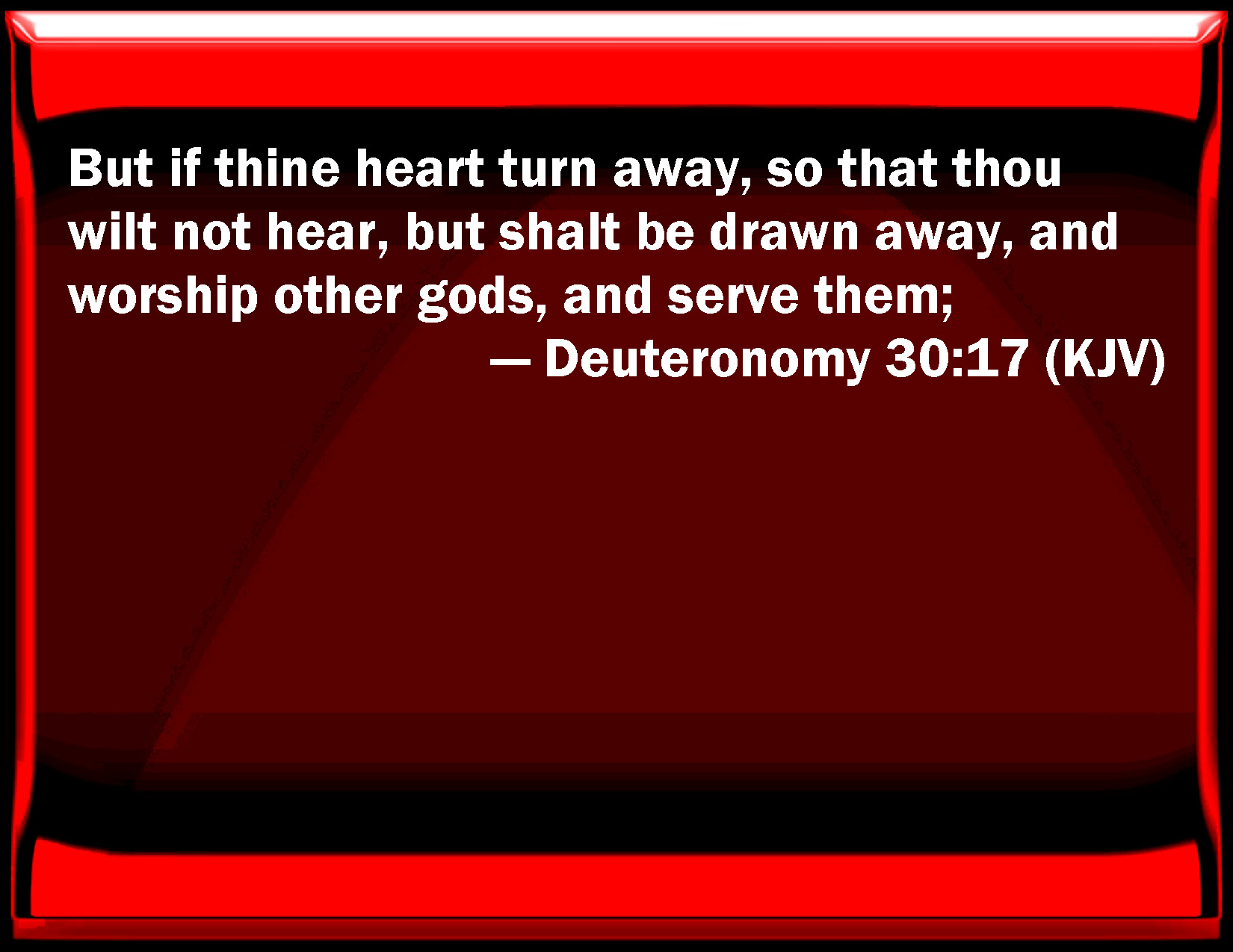 Bible Verse Slide Deuteronomy 30:17 But if your heart turn away, so that you will not hear, but shall be drawn away, and worship other gods, and serve them; KJV: But if thine heart turn away, so that thou wilt not hear, but shalt be drawn away, and worship other gods, and serve them; DRB: But if thy heart be turned away, so that thou wilt not hear, and being deceived with error thou adore strange gods, and serve them: DBT: But if thy heart turn away, so that thou wilt not hear, but shalt be drawn away, and thou shalt bow down to other gods and serve them; ERV: But if thine heart turn away, and thou wilt not hear, but shalt be drawn away, and worship other gods, and serve them; WBT: But if thy heart shall turn away, so that thou wilt not hear, but shalt be drawn away, and worship other gods, and serve them; WEB: But if your heart turns away, and you will not hear, but shall be drawn away, and worship other gods, and serve them; YLT: 'And if thy heart doth turn, and thou dost not hearken, and hast been driven away, and hast bowed thyself to other gods, and served them,Links Deuteronomy 30:17 NIV • Deuteronomy 30:17 NLT • Deuteronomy 30:17 ESV • Deuteronomy 30:17 NASB • Deuteronomy 30:17 KJV • Deuteronomy 30:17 Interlinear • Deuteronomy 30:17 Commentaries • Deuteronomy 30:17 Parallel Texts • Deuteronomy 30:17 Bible Apps • Deuteronomy 30:17 Parallel • Bible Hub |