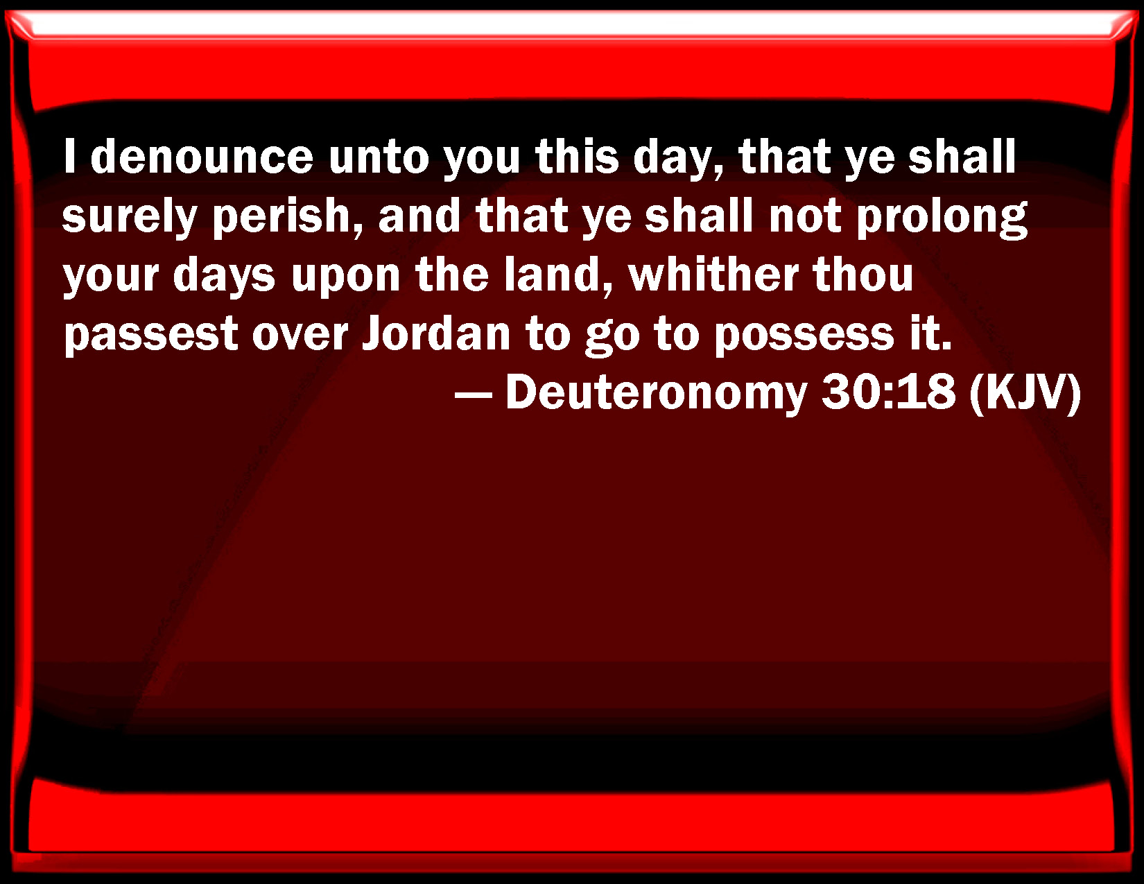 Bible Verse Slide Deuteronomy 30:18 I denounce to you this day, that you shall surely perish, and that you shall not prolong your days on the land, where you pass over Jordan to go to possess it. KJV: I denounce unto you this day, that ye shall surely perish, and that ye shall not prolong your days upon the land, whither thou passest over Jordan to go to possess it. DRB: I foretell thee this day that thou shalt perish, and shalt remain but a short time in the land, to which thou shalt pass over the Jordan, and shalt go in to possess it. DBT: I denounce unto you this day that ye shall surely perish; ye shall not prolong your days upon the land whereunto thou passest over the Jordan to possess it. ERV: I denounce unto you this day, that ye shall surely perish; ye shall not prolong your days upon the land, whither thou passest over Jordan to go in to possess it. WBT: I denounce to you this day, that ye shall surely perish, and that ye shall not prolong your days upon the land, whither thou passest over Jordan to go to possess it. WEB: I denounce to you this day, that you shall surely perish; you shall not prolong your days in the land, where you pass over the Jordan to go in to possess it. YLT: I have declared to you this day, that ye do certainly perish, ye do not prolong days on the ground which thou art passing over the Jordan to go in thither to possess it.Links Deuteronomy 30:18 NIV • Deuteronomy 30:18 NLT • Deuteronomy 30:18 ESV • Deuteronomy 30:18 NASB • Deuteronomy 30:18 KJV • Deuteronomy 30:18 Interlinear • Deuteronomy 30:18 Commentaries • Deuteronomy 30:18 Parallel Texts • Deuteronomy 30:18 Bible Apps • Deuteronomy 30:18 Parallel • Bible Hub |