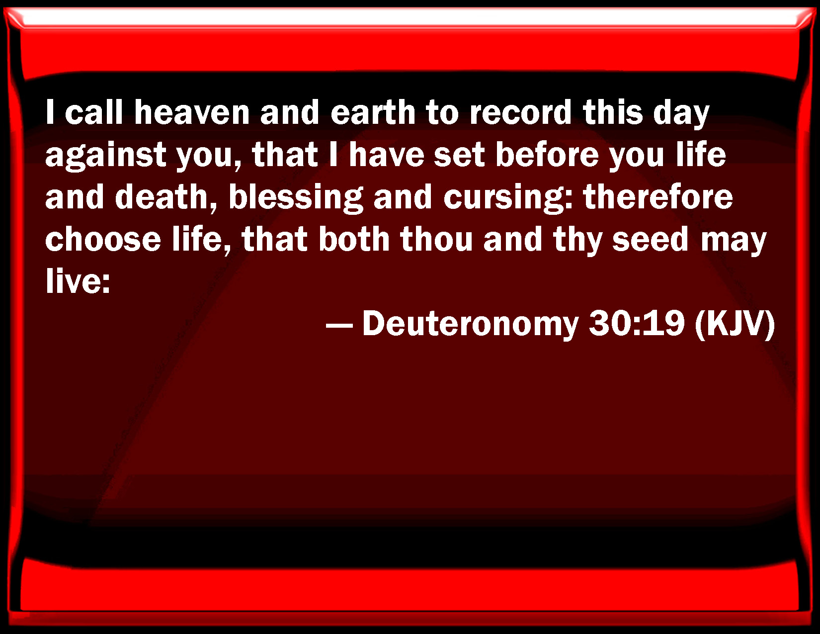 Bible Verse Slide Deuteronomy 30:19 I call heaven and earth to record this day against you, that I have set before you life and death, blessing and cursing: therefore choose life, that both you and your seed may live: KJV: I call heaven and earth to record this day against you, that I have set before you life and death, blessing and cursing: therefore choose life, that both thou and thy seed may live: DRB: I call heaven and earth to witness this day, that I have set before you life and death, blessing and cursing. Choose therefore life, that both thou and thy seed may live: DBT: I call heaven and earth to witness this day against you: life and death have I set before you, blessing and cursing: choose then life, that thou mayest live, thou and thy seed, ERV: I call heaven and earth to witness against you this day, that I have set before thee life and death, the blessing and the curse: therefore choose life, that thou mayest live, thou and thy seed: WBT: I call heaven and earth to record this day against you, that I have set before you life and death, blessing and cursing: therefore choose life, that both thou and thy seed may live: WEB: I call heaven and earth to witness against you this day, that I have set before you life and death, the blessing and the curse: therefore choose life, that you may live, you and your seed; YLT: 'I have caused to testify against you to-day the heavens and the earth; life and death I have set before thee, the blessing and the reviling; and thou hast fixed on life, so that thou dost live, thou and thy seed,Links Deuteronomy 30:19 NIV • Deuteronomy 30:19 NLT • Deuteronomy 30:19 ESV • Deuteronomy 30:19 NASB • Deuteronomy 30:19 KJV • Deuteronomy 30:19 Interlinear • Deuteronomy 30:19 Commentaries • Deuteronomy 30:19 Parallel Texts • Deuteronomy 30:19 Bible Apps • Deuteronomy 30:19 Parallel • Bible Hub |