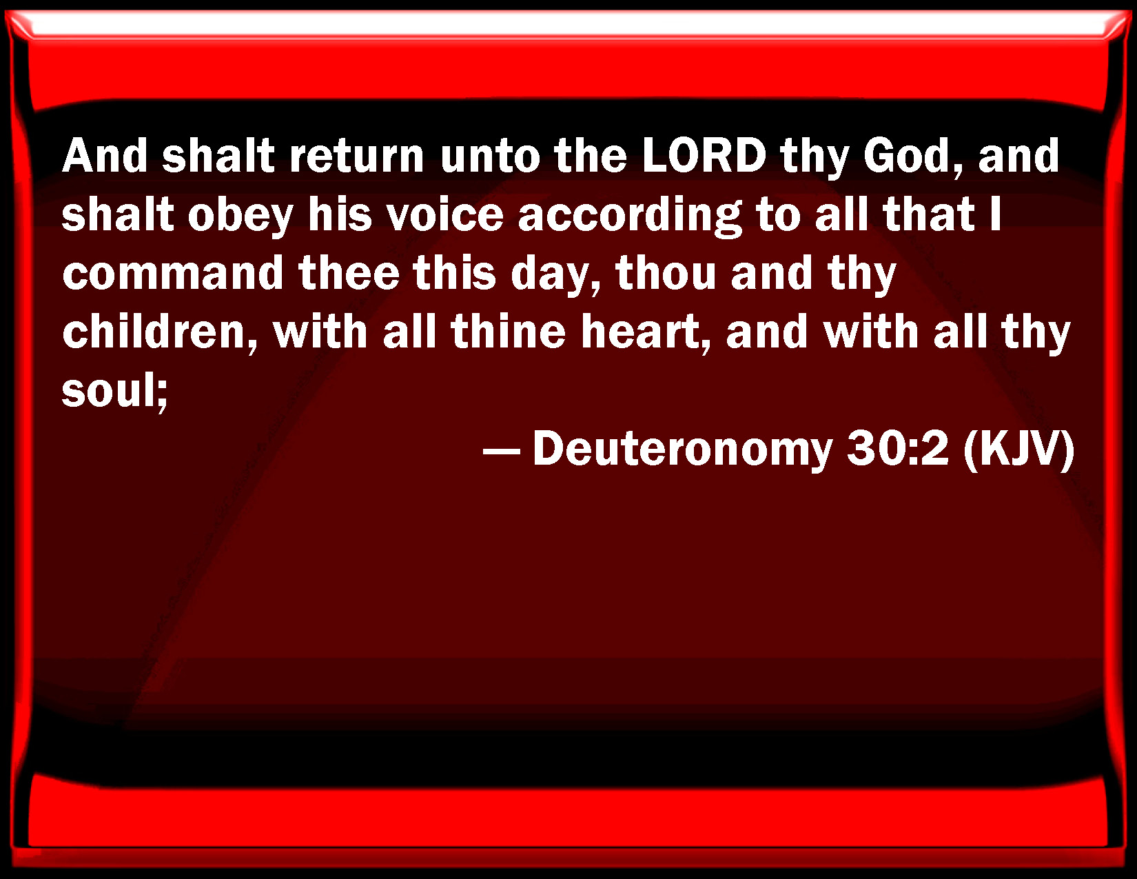 Bible Verse Slide Deuteronomy 30:2 And shall return to the LORD your God, and shall obey his voice according to all that I command you this day, you and your children, with all your heart, and with all your soul; KJV: And shalt return unto the LORD thy God, and shalt obey his voice according to all that I command thee this day, thou and thy children, with all thine heart, and with all thy soul; DRB: And shalt return to him, and obey his commandments, as I command thee this day, thou and thy children, with all thy heart, and with all thy soul: DBT: and shalt return to Jehovah thy God, and shalt hearken to his voice according to all that I command thee this day, thou and thy sons, with all thy heart and with all thy soul; ERV: and shalt return unto the LORD thy God, and shalt obey his voice according to all that I command thee this day, thou and thy children, with all thine heart, and with all thy soul; WBT: And shalt return to the LORD thy God, and shalt obey his voice according to all that I command thee this day, thou and thy children, with all thy heart, and with all thy soul; WEB: and shall return to Yahweh your God, and shall obey his voice according to all that I command you this day, you and your children, with all your heart, and with all your soul; YLT: and hast turned back unto Jehovah thy God, and hearkened to His voice, according to all that I am commanding thee to-day, thou and thy sons, with all thy heart, and with all thy soul — Links Deuteronomy 30:2 NIV • Deuteronomy 30:2 NLT • Deuteronomy 30:2 ESV • Deuteronomy 30:2 NASB • Deuteronomy 30:2 KJV • Deuteronomy 30:2 Interlinear • Deuteronomy 30:2 Commentaries • Deuteronomy 30:2 Parallel Texts • Deuteronomy 30:2 Bible Apps • Deuteronomy 30:2 Parallel • Bible Hub |