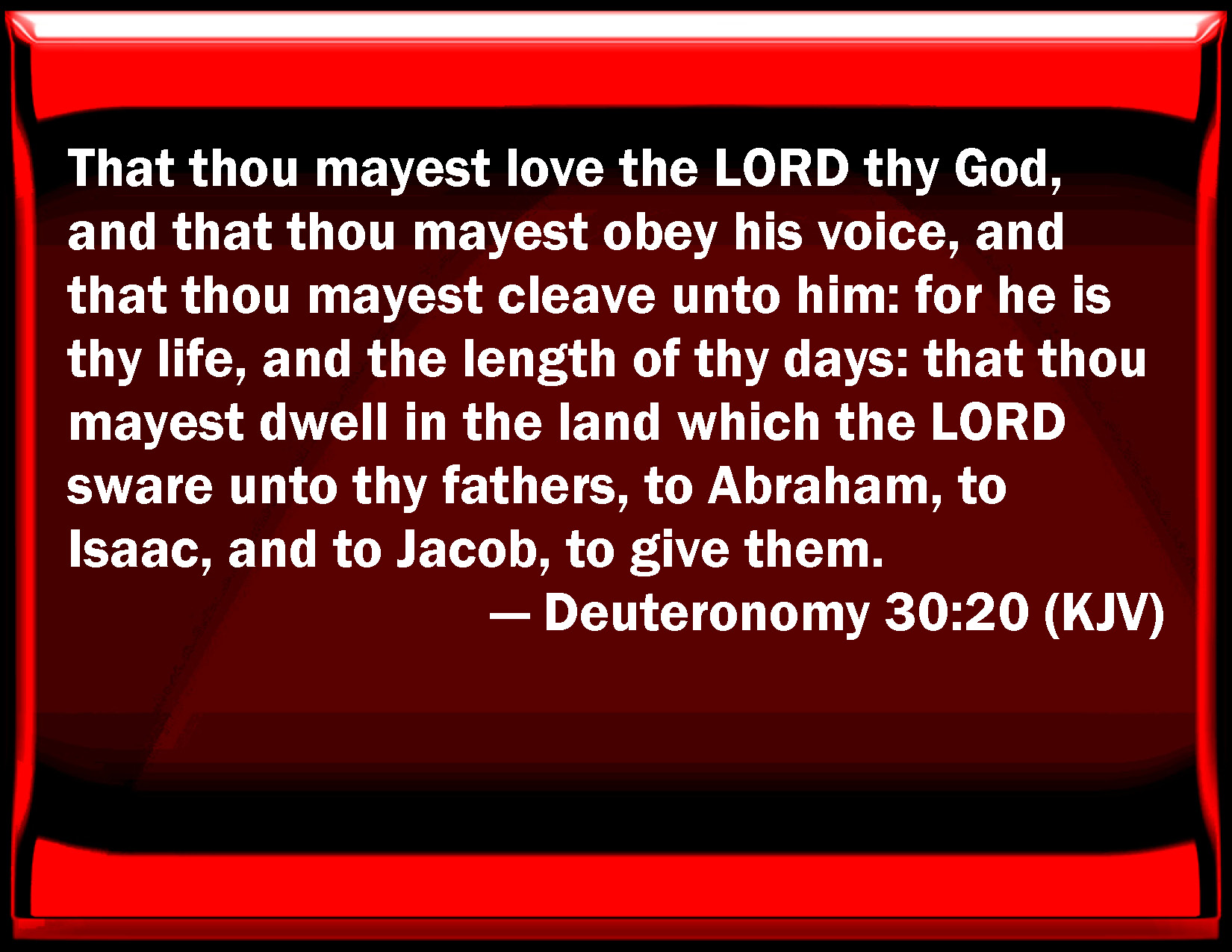 Bible Verse Slide Deuteronomy 30:20 That you may love the LORD your God, and that you may obey his voice, and that you may hold to him: for he is your life, and the length of your days: that you may dwell in the land which the LORD swore to your fathers, to Abraham, to Isaac, and to Jacob, to give them. KJV: That thou mayest love the LORD thy God, and that thou mayest obey his voice, and that thou mayest cleave unto him: for he is thy life, and the length of thy days: that thou mayest dwell in the land which the LORD sware unto thy fathers, to Abraham, to Isaac, and to Jacob, to give them. DRB: And that thou mayst love the Lord thy God, and obey his voice, and adhere to him (for he is thy life, and the length of thy days,) that thou mayst dwell in the land, for which the Lord swore to thy fathers Abraham, Isaac, and Jacob that he would give it them. DBT: in loving Jehovah thy God, in hearkening to his voice, and in cleaving to him for this is thy life and the length of thy days that thou mayest dwell in the land which Jehovah swore unto thy fathers, to Abraham, to Isaac, and to Jacob, to give them. ERV: to love the LORD thy God, to obey his voice, and to cleave unto him: for he is thy life, and the length of thy days: that thou mayest dwell in the land which the LORD sware unto thy fathers, to Abraham, to Isaac, and to Jacob, to give them. WBT: That thou mayest love the LORD thy God, and that thou mayest obey his voice, and that thou mayest cleave to him (for he is thy life, and the length of thy days) that thou mayest dwell in the land which the LORD swore to thy fathers, to Abraham, to Isaac, and to Jacob, to give them. WEB: to love Yahweh your God, to obey his voice, and to cling to him; for he is your life, and the length of your days; that you may dwell in the land which Yahweh swore to your fathers, to Abraham, to Isaac, and to Jacob, to give them. YLT: to love Jehovah thy God, to hearken to His voice, and to cleave to Him (for He is thy life, and the length of thy days), to dwell on the ground which Jehovah hath sworn to thy fathers, to Abraham, to Isaac, and to Jacob, to give to them.'Links Deuteronomy 30:20 NIV • Deuteronomy 30:20 NLT • Deuteronomy 30:20 ESV • Deuteronomy 30:20 NASB • Deuteronomy 30:20 KJV • Deuteronomy 30:20 Interlinear • Deuteronomy 30:20 Commentaries • Deuteronomy 30:20 Parallel Texts • Deuteronomy 30:20 Bible Apps • Deuteronomy 30:20 Parallel • Bible Hub |