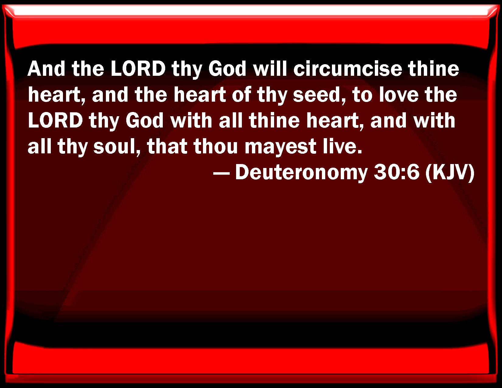 Bible Verse Slide Deuteronomy 30:6 And the LORD your God will circumcise your heart, and the heart of your seed, to love the LORD your God with all your heart, and with all your soul, that you may live. KJV: And the LORD thy God will circumcise thine heart, and the heart of thy seed, to love the LORD thy God with all thine heart, and with all thy soul, that thou mayest live. DRB: The Lord thy God will circumcise thy heart, and the heart of thy seed: that then mayst love the Lord thy God with all thy heart and with all thy soul, that thou mayst live. DBT: And Jehovah thy God will circumcise thy heart, and the heart of thy seed, to love Jehovah thy God with all thy heart and with all thy soul, that thou mayest live. ERV: And the LORD thy God will circumcise thine heart, and the heart of thy seed, to love the LORD thy God with all thine heart, and with all thy soul, that thou mayest live. WBT: And the LORD thy God will circumcise thy heart, and the heart of thy seed, to love the LORD thy God with all thy heart, and with all thy soul, that thou mayest live. WEB: Yahweh your God will circumcise your heart, and the heart of your seed, to love Yahweh your God with all your heart, and with all your soul, that you may live. YLT: 'And Jehovah thy God hath circumcised thy heart, and the heart of thy seed, to love Jehovah thy God with all thy heart, and with all thy soul, for the sake of thy life;Links Deuteronomy 30:6 NIV • Deuteronomy 30:6 NLT • Deuteronomy 30:6 ESV • Deuteronomy 30:6 NASB • Deuteronomy 30:6 KJV • Deuteronomy 30:6 Interlinear • Deuteronomy 30:6 Commentaries • Deuteronomy 30:6 Parallel Texts • Deuteronomy 30:6 Bible Apps • Deuteronomy 30:6 Parallel • Bible Hub |