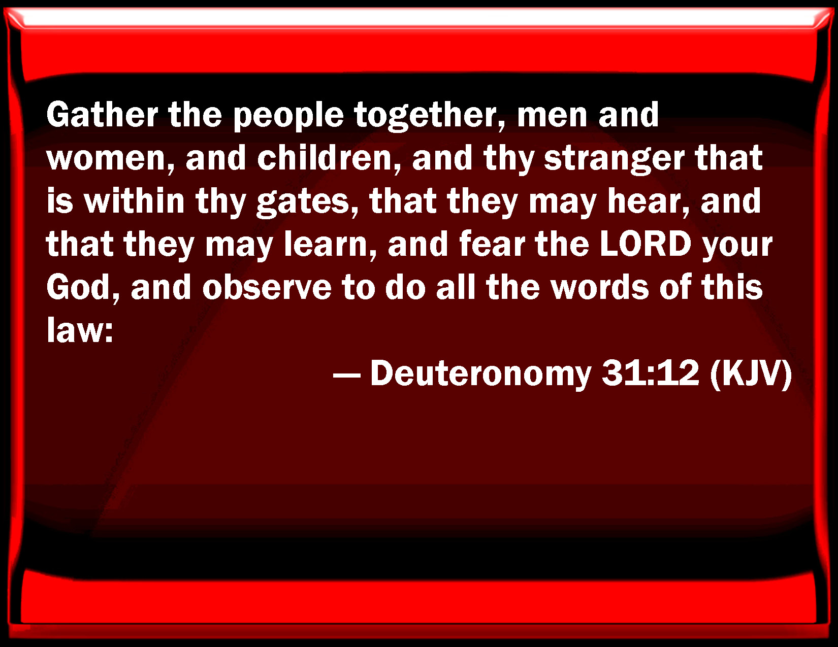 Bible Verse Slide Deuteronomy 31:12 Gather the people together, men and women, and children, and your stranger that is within your gates, that they may hear, and that they may learn, and fear the LORD your God, and observe to do all the words of this law: KJV: Gather the people together, men, and women, and children, and thy stranger that is within thy gates, that they may hear, and that they may learn, and fear the LORD your God, and observe to do all the words of this law: DRB: And the people being all assembled together, both men and women, children and strangers, that are within thy gates: that hearing they may learn, and fear the Lord your God, and keep, and fulfil all the words of this law: DBT: Gather the people together, the men, and the women, and the children, and thy stranger that is within thy gates, that they may hear, and that they may learn, and fear Jehovah your God, and take heed to do all the words of this law; ERV: Assemble the people, the men and the women and the little ones, and thy stranger that is within thy gates, that they may hear, and that they may learn, and fear the LORD your God, and observe to do all the words of this law; WBT: Convene the people, men, and women, and children, and thy stranger that is within thy gates, that they may hear, and that they may learn, and fear the LORD your God, and observe to do all the words of this law: WEB: Assemble the people, the men and the women and the little ones, and your foreigner who is within your gates, that they may hear, and that they may learn, and fear Yahweh your God, and observe to do all the words of this law; YLT: Assemble the people, the men, and the women, and the infants, and thy sojourner who is within thy gates, so that they hear, and so that they learn, and have feared Jehovah your God, and observed to do all the words of this law;Links Deuteronomy 31:12 NIV • Deuteronomy 31:12 NLT • Deuteronomy 31:12 ESV • Deuteronomy 31:12 NASB • Deuteronomy 31:12 KJV • Deuteronomy 31:12 Interlinear • Deuteronomy 31:12 Commentaries • Deuteronomy 31:12 Parallel Texts • Deuteronomy 31:12 Bible Apps • Deuteronomy 31:12 Parallel • Bible Hub |