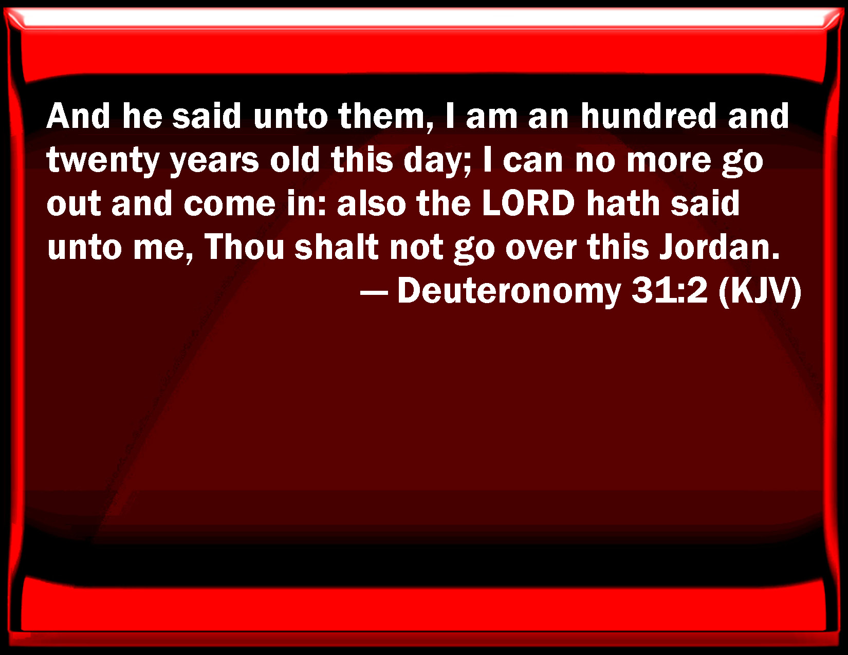 Bible Verse Slide Deuteronomy 31:2 And he said to them, I am an hundred and twenty years old this day; I can no more go out and come in: also the LORD has said to me, You shall not go over this Jordan. KJV: And he said unto them, I am an hundred and twenty years old this day; I can no more go out and come in: also the LORD hath said unto me, Thou shalt not go over this Jordan. DRB: And he said to them: I am this day a hundred and twenty years old, I can no longer go out and come in, especially as the Lord also hath said to me: Thou shalt not pass over this Jordan. DBT: and he said unto them, I am a hundred and twenty years old this day, I can no more go out and come in; and Jehovah hath said unto me, Thou shalt not go over this Jordan. ERV: And he said unto them, I am an hundred and twenty years old this day; I can no more go out and come in: and the LORD hath said unto me, Thou shalt not go over this Jordan. WBT: And he said to them, I am a hundred and twenty years old this day; I can no more go out and come in: also the LORD hath said to me, thou shalt not go over this Jordan. WEB: He said to them, "I am one hundred twenty years old this day; I can no more go out and come in: and Yahweh has said to me, 'You shall not go over this Jordan.' YLT: and he saith unto them, 'A son of a hundred and twenty years am I to-day; I am not able any more to go out and to come in, and Jehovah hath said unto me, Thou dost not pass over this Jordan,Links Deuteronomy 31:2 NIV • Deuteronomy 31:2 NLT • Deuteronomy 31:2 ESV • Deuteronomy 31:2 NASB • Deuteronomy 31:2 KJV • Deuteronomy 31:2 Interlinear • Deuteronomy 31:2 Commentaries • Deuteronomy 31:2 Parallel Texts • Deuteronomy 31:2 Bible Apps • Deuteronomy 31:2 Parallel • Bible Hub |