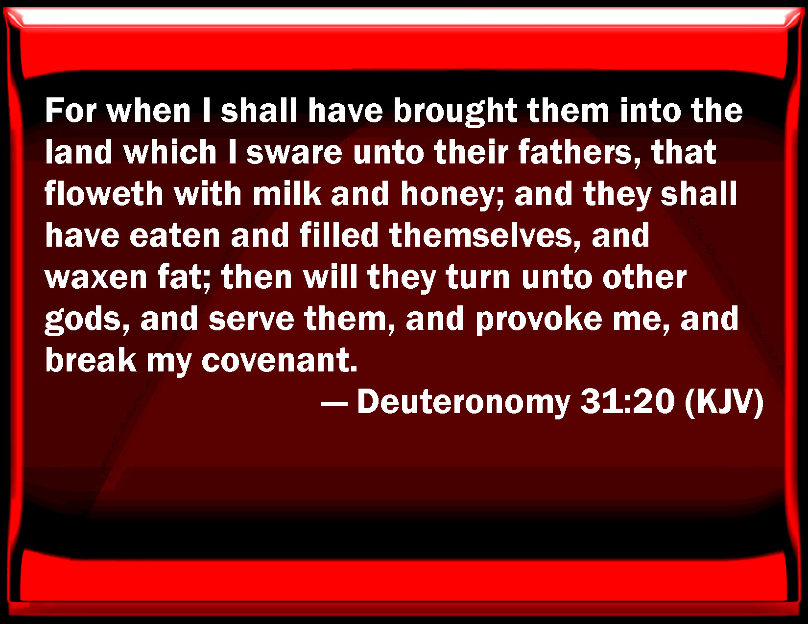 Bible Verse Slide Deuteronomy 31:20 For when I shall have brought them into the land which I swore to their fathers, that flows with milk and honey; and they shall have eaten and filled themselves, and waxen fat; then will they turn to other gods, and serve them, and provoke me, and break my covenant. KJV: For when I shall have brought them into the land which I sware unto their fathers, that floweth with milk and honey; and they shall have eaten and filled themselves, and waxen fat; then will they turn unto other gods, and serve them, and provoke me, and break my covenant. DRB: For I will bring them into the land, for which I swore to their fathers, that floweth with milk and honey. And when they have eaten, and are full and fat, they will turn away after strange gods, and will serve them: and will despise me, and make void my covenant. DBT: For I shall bring them into the land which I swore unto their fathers, which floweth with milk and honey; and they will eat and fill themselves, and wax fat, and will turn unto other gods, and serve them, and despise me, and break my covenant. ERV: For when I shall have brought them into the land which I sware unto their fathers, flowing with milk and honey; and they shall have eaten and filled themselves, and waxen fat; then will they turn unto other gods, and serve them, and despise me, and break my covenant. WBT: For when I shall have brought them into the land which I swore to their fathers, that floweth with milk and honey; and they shall have eaten and filled themselves, and waxed fat; then will they turn to other gods, and serve them, and provoke me, and break my covenant. WEB: For when I shall have brought them into the land which I swore to their fathers, flowing with milk and honey, and they shall have eaten and filled themselves, and grown fat; then will they turn to other gods, and serve them, and despise me, and break my covenant. YLT: and I bring them in unto the ground which I have sworn to their fathers — flowing with milk and honey, and they have eaten, and been satisfied, and been fat, and have turned unto other gods, and they have served them, and despised Me, and broken My covenant.Links Deuteronomy 31:20 NIV • Deuteronomy 31:20 NLT • Deuteronomy 31:20 ESV • Deuteronomy 31:20 NASB • Deuteronomy 31:20 KJV • Deuteronomy 31:20 Interlinear • Deuteronomy 31:20 Commentaries • Deuteronomy 31:20 Parallel Texts • Deuteronomy 31:20 Bible Apps • Deuteronomy 31:20 Parallel • Bible Hub |