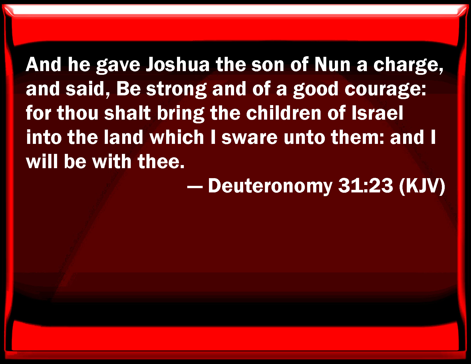 Bible Verse Slide Deuteronomy 31:23 And he gave Joshua the son of Nun a charge, and said, Be strong and of a good courage: for you shall bring the children of Israel into the land which I swore to them: and I will be with you. KJV: And he gave Joshua the son of Nun a charge, and said, Be strong and of a good courage: for thou shalt bring the children of Israel into the land which I sware unto them: and I will be with thee. DRB: And the Lord commanded Josue the son of Nun, and said: Take courage, and be valiant: for thou shalt bring the children of Israel into the land which I have promised, and I will be with thee. DBT: And Jehovah commanded Joshua the son of Nun, and said, Be strong and courageous; for thou shalt bring the children of Israel into the land which I have sworn unto them; and I will be with thee. ERV: And he gave Joshua the son of Nun a charge, and said, Be strong and of a good courage: for thou shalt bring the children of Israel into the land which I sware unto them: and I will be with thee. WBT: And he gave Joshua the son of Nun a charge, and said, Be strong and of a good courage: for thou shalt bring the children of Israel into the land which I swore to them: and I will be with thee. WEB: He commissioned Joshua the son of Nun, and said, "Be strong and courageous; for you shall bring the children of Israel into the land which I swore to them: and I will be with you." YLT: and He commandeth Joshua son of Nun, and saith, 'Be strong and courageous, for thou dost bring in the sons of Israel unto the land which I have sworn to them, and I — I am with thee.'Links Deuteronomy 31:23 NIV • Deuteronomy 31:23 NLT • Deuteronomy 31:23 ESV • Deuteronomy 31:23 NASB • Deuteronomy 31:23 KJV • Deuteronomy 31:23 Interlinear • Deuteronomy 31:23 Commentaries • Deuteronomy 31:23 Parallel Texts • Deuteronomy 31:23 Bible Apps • Deuteronomy 31:23 Parallel • Bible Hub |