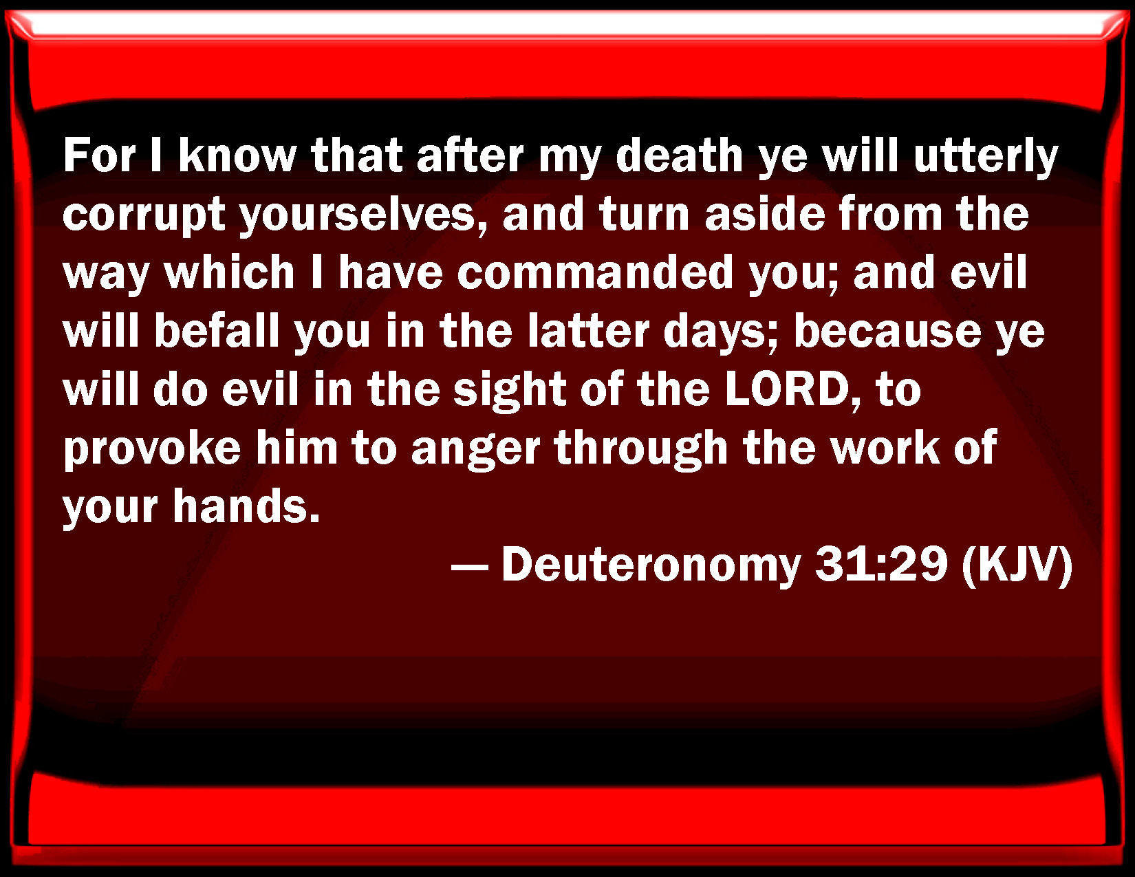 Deuteronomy 31:29 For I know that after my death you will utterly corrupt yourselves, and turn aside from the way which I have commanded you; and evil will befall you in the latter days; because you will do evil in the sight of the LORD, to provoke him to anger through the work of your hands.