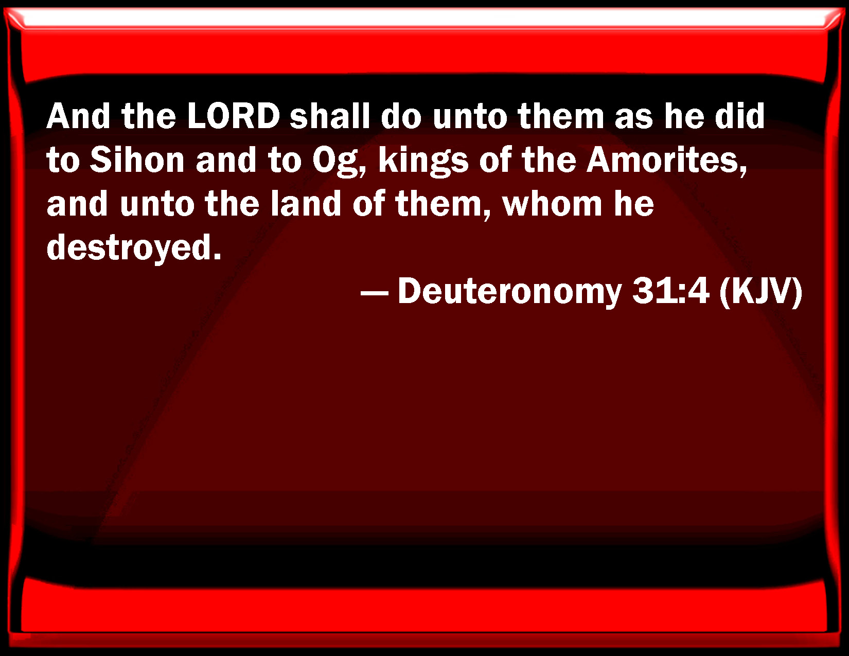 Bible Verse Slide Deuteronomy 31:4 And the LORD shall do to them as he did to Sihon and to Og, kings of the Amorites, and to the land of them, whom he destroyed. KJV: And the LORD shall do unto them as he did to Sihon and to Og, kings of the Amorites, and unto the land of them, whom he destroyed. DRB: And the Lord shall do to them as he did to Sehon and Og the kings of the Amorrhites, and to their land, and shall destroy them. DBT: And Jehovah will do to them as he did to Sihon and to Og, the kings of the Amorites, and to their land; whom he destroyed. ERV: And the LORD shall do unto them as he did to Sihon and to Og, the kings of the Amorites, and unto their land; whom he destroyed. WBT: And the LORD shall do to them as he did to Sihon, and to Og, kings of the Amorites, and to the land of them, whom he destroyed. WEB: Yahweh will do to them as he did to Sihon and to Og, the kings of the Amorites, and to their land; whom he destroyed. YLT: and Jehovah hath done to them as he hath done to Sihon and to Og, kings of the Amorite, and to their land, whom He destroyed.Links Deuteronomy 31:4 NIV • Deuteronomy 31:4 NLT • Deuteronomy 31:4 ESV • Deuteronomy 31:4 NASB • Deuteronomy 31:4 KJV • Deuteronomy 31:4 Interlinear • Deuteronomy 31:4 Commentaries • Deuteronomy 31:4 Parallel Texts • Deuteronomy 31:4 Bible Apps • Deuteronomy 31:4 Parallel • Bible Hub |
