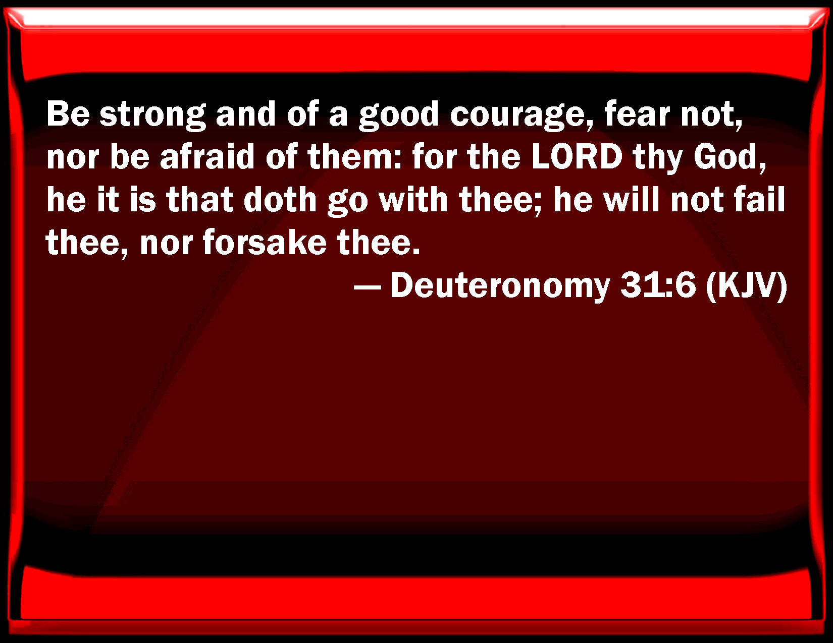 Bible Verse Slide Deuteronomy 31:6 Be strong and of a good courage, fear not, nor be afraid of them: for the LORD your God, he it is that does go with you; he will not fail you, nor forsake you. KJV: Be strong and of a good courage, fear not, nor be afraid of them: for the LORD thy God, he it is that doth go with thee; he will not fail thee, nor forsake thee. DRB: Do manfully and be of good heart: fear not, nor be ye dismayed at their sight: for the Lord thy God he himself is thy leader, and will not leave thee nor forsake thee. DBT: Be strong and courageous, fear them not, neither be afraid of them; for Jehovah thy God, he it is that goeth with thee; he will not leave thee, nor forsake thee. ERV: Be strong and of a good courage, fear not, nor be affrighted at them: for the LORD thy God, he it is that doth go with thee; he will not fail thee, nor forsake thee. WBT: Be strong and of a good courage, fear not, nor be afraid of them: for the LORD thy God, he it is that doth go with thee, he will not fail thee, nor forsake thee. WEB: Be strong and courageous, don't be afraid, nor be scared of them: for Yahweh your God, he it is who does go with you; he will not fail you, nor forsake you." YLT: be strong and courageous, fear not, nor be terrified because of them, for Jehovah thy God is He who is going with thee; He doth not fail thee nor forsake thee.'Links Deuteronomy 31:6 NIV • Deuteronomy 31:6 NLT • Deuteronomy 31:6 ESV • Deuteronomy 31:6 NASB • Deuteronomy 31:6 KJV • Deuteronomy 31:6 Interlinear • Deuteronomy 31:6 Commentaries • Deuteronomy 31:6 Parallel Texts • Deuteronomy 31:6 Bible Apps • Deuteronomy 31:6 Parallel • Bible Hub |