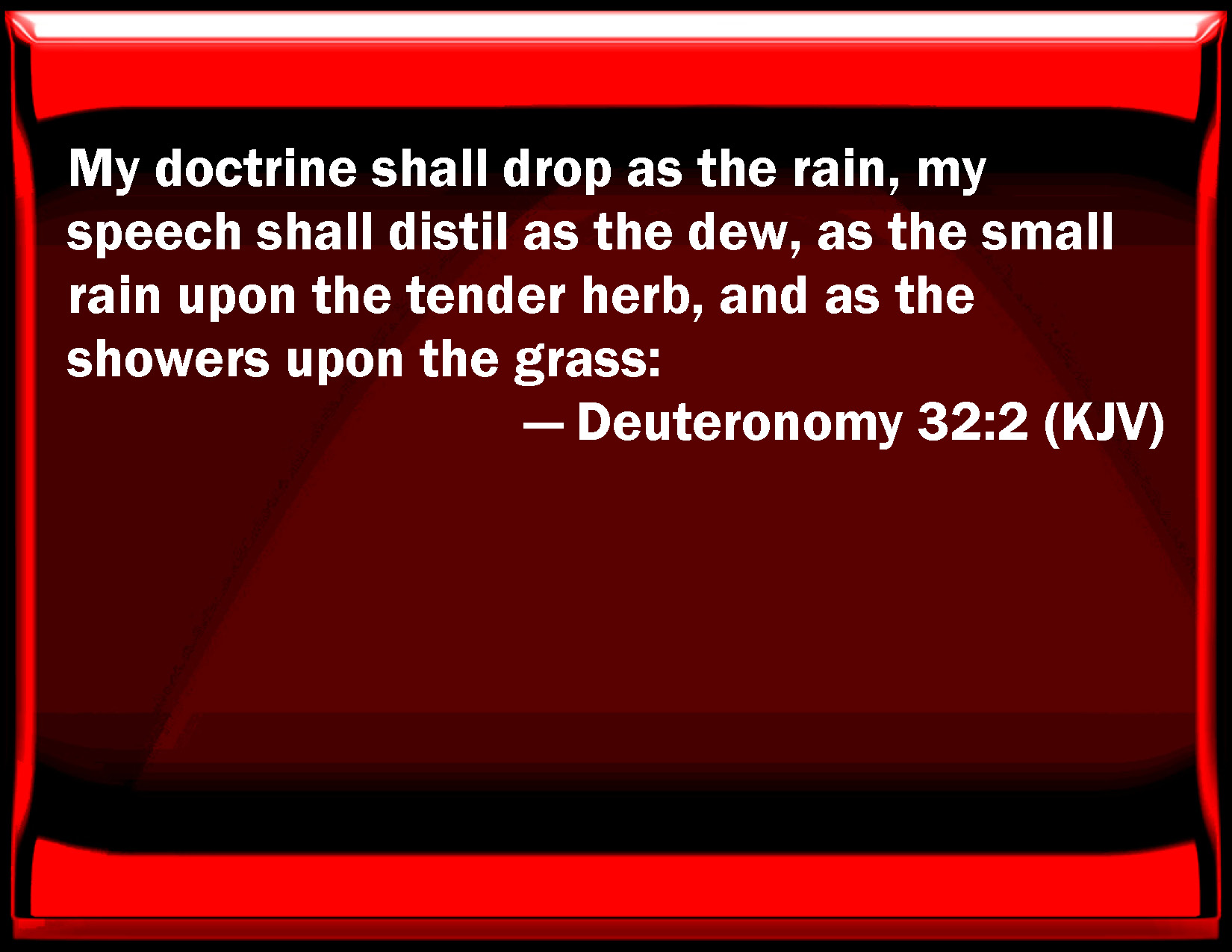 Bible Verse Slide Deuteronomy 32:2 My doctrine shall drop as the rain, my speech shall distil as the dew, as the small rain on the tender herb, and as the showers on the grass: KJV: My doctrine shall drop as the rain, my speech shall distil as the dew, as the small rain upon the tender herb, and as the showers upon the grass: DRB: Let my doctrine gather as the rain, let my speech distil as the dew, as a shower upon the herb, and as drops upon the grass. DBT: My doctrine shall drop as rain, My speech flow down as dew, As small rain upon the tender herb, And as showers on the grass. ERV: My doctrine shall drop as the rain, My speech shall distil as the dew; As the small rain upon the tender grass, And as the showers upon the herb: WBT: My doctrine shall drop as the rain, my speech shall distill as the dew, as the small rain upon the tender herb, and as the showers upon the grass: WEB: My doctrine shall drop as the rain. My speech shall condense as the dew, as the small rain on the tender grass, as the showers on the herb. YLT: Drop as rain doth My doctrine; Flow as dew doth My sayings; As storms on the tender grass, And as showers on the herb,Links Deuteronomy 32:2 NIV • Deuteronomy 32:2 NLT • Deuteronomy 32:2 ESV • Deuteronomy 32:2 NASB • Deuteronomy 32:2 KJV • Deuteronomy 32:2 Interlinear • Deuteronomy 32:2 Commentaries • Deuteronomy 32:2 Parallel Texts • Deuteronomy 32:2 Bible Apps • Deuteronomy 32:2 Parallel • Bible Hub |