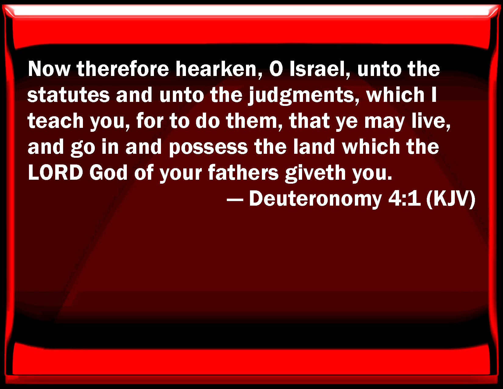 Bible Verse Slide Deuteronomy 4:1 Now therefore listen, O Israel, to the statutes and to the judgments, which I teach you, for to do them, that you may live, and go in and possess the land which the LORD God of your fathers gives you. KJV: Now therefore hearken, O Israel, unto the statutes and unto the judgments, which I teach you, for to do them, that ye may live, and go in and possess the land which the LORD God of your fathers giveth you. DRB: And now, O Israel, hear the commandments and judgments which I teach thee: that doing them, thou mayst live, and entering in mayst possess the land which the Lord the God of your fathers will give you. DBT: And now, Israel, hearken to the statutes and to the ordinances which I teach you, to do them, that ye may live, and go in and possess the land which Jehovah the God of your fathers giveth you. ERV: And now, O Israel, hearken unto the statutes and unto the judgments, which I teach you, for to do them; that ye may live, and go in and possess the land which the LORD, the God of your fathers, giveth you. WBT: Now therefore hearken, O Israel, to the statutes and to the judgments, which I teach you, to do them, that ye may live, and go in and possess the land which the LORD God of your fathers giveth you. WEB: Now, Israel, listen to the statutes and to the ordinances, which I teach you, to do them; that you may live, and go in and possess the land which Yahweh, the God of your fathers, gives you. YLT: 'And now, Israel, hearken unto the statutes, and unto the judgments which I am teaching you to do, so that ye live, and have gone in, and possessed the land which Jehovah God of your fathers is giving to you.Links Deuteronomy 4:1 NIV • Deuteronomy 4:1 NLT • Deuteronomy 4:1 ESV • Deuteronomy 4:1 NASB • Deuteronomy 4:1 KJV • Deuteronomy 4:1 Interlinear • Deuteronomy 4:1 Commentaries • Deuteronomy 4:1 Parallel Texts • Deuteronomy 4:1 Bible Apps • Deuteronomy 4:1 Parallel • Bible Hub |