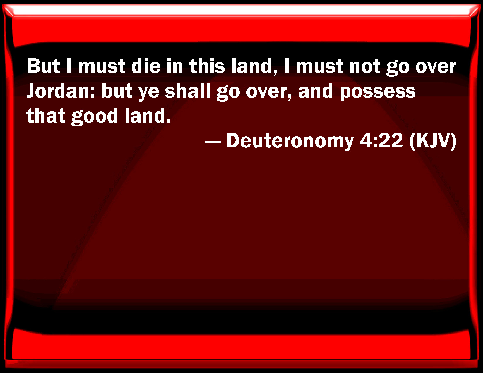 Bible Verse Slide Deuteronomy 4:22 But I must die in this land, I must not go over Jordan: but you shall go over, and possess that good land. KJV: But I must die in this land, I must not go over Jordan: but ye shall go over, and possess that good land. DRB: Behold I die in this land, I shall not pass over the Jordan: you shall pass, and possess the goodly land. DBT: for I shall die in this land, I shall not go over the Jordan; but ye shall go over, and possess this good land. ERV: but I must die in this land, I must not go over Jordan: but ye shall go over, and possess that good land. WBT: But I must die in this land, I must not go over Jordan: but ye shall go over, and possess that good land. WEB: but I must die in this land, I must not go over the Jordan; but you shall go over, and possess that good land. YLT: for I am dying in this land; I am not passing over the Jordan, and ye are passing over, and have possessed this good land.Links Deuteronomy 4:22 NIV • Deuteronomy 4:22 NLT • Deuteronomy 4:22 ESV • Deuteronomy 4:22 NASB • Deuteronomy 4:22 KJV • Deuteronomy 4:22 Interlinear • Deuteronomy 4:22 Commentaries • Deuteronomy 4:22 Parallel Texts • Deuteronomy 4:22 Bible Apps • Deuteronomy 4:22 Parallel • Bible Hub |