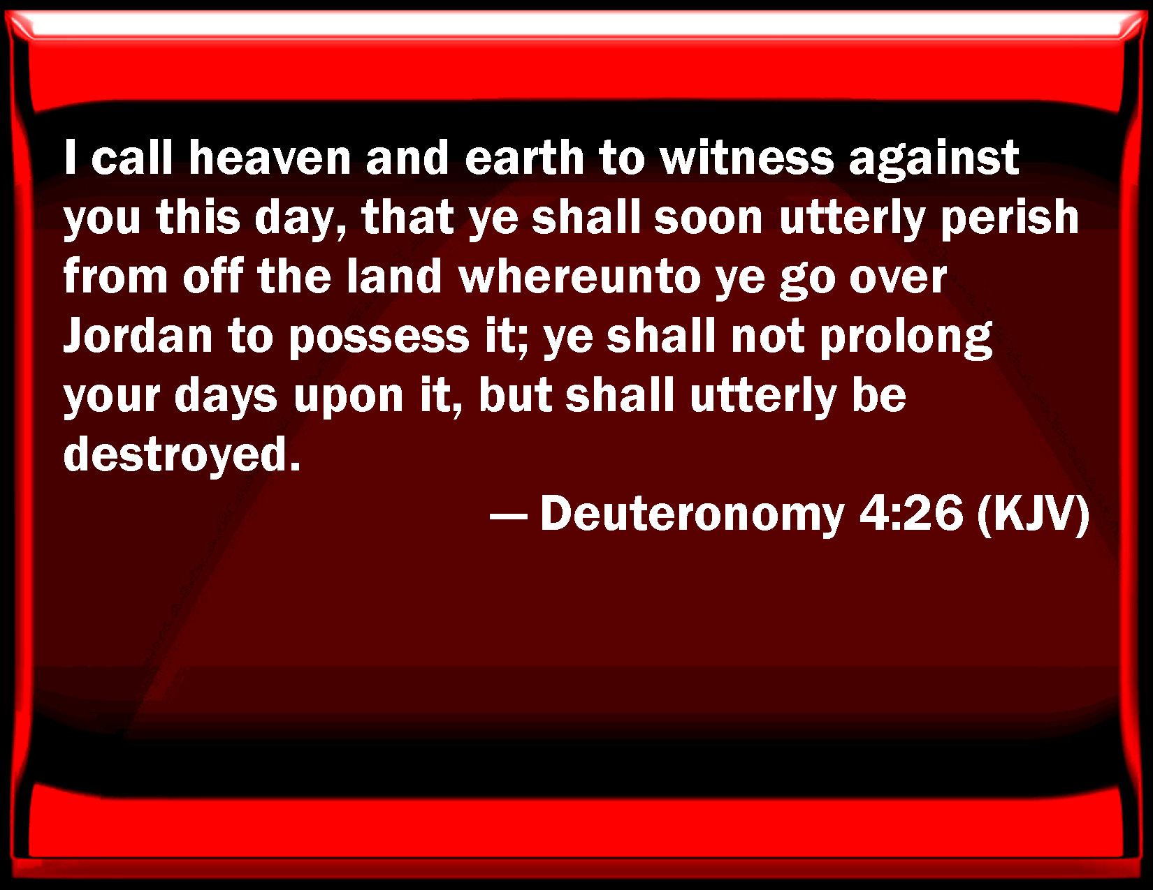 Bible Verse Slide Deuteronomy 4:26 I call heaven and earth to witness against you this day, that you shall soon utterly perish from off the land whereunto you go over Jordan to possess it; you shall not prolong your days on it, but shall utterly be destroyed. KJV: I call heaven and earth to witness against you this day, that ye shall soon utterly perish from off the land whereunto ye go over Jordan to possess it; ye shall not prolong your days upon it, but shall utterly be destroyed. DRB: I call this day heaven and earth to witness, that you shall quickly perish out of the land, which, when you have passed over the Jordan, you shall possess. You shall not dwell therein long, but the Lord will destroy you, DBT: I call heaven and earth to witness against you this day, that ye shall soon utterly perish from off the land whereunto ye pass over the Jordan to possess it: ye shall not prolong your days on it, but shall be utterly destroyed. ERV: I call heaven and earth to witness against you this day, that ye shall soon utterly perish from off the land whereunto ye go over Jordan to possess it; ye shall not prolong your days upon it, but shall utterly be destroyed. WBT: I call heaven and earth to witness against you this day, that ye shall soon utterly perish from the land to which ye go over Jordan to possess it; ye shall not prolong your days upon it, but shall be utterly destroyed. WEB: I call heaven and earth to witness against you this day, that you shall soon utterly perish from off the land whereunto you go over the Jordan to possess it; you shall not prolong your days on it, but shall utterly be destroyed. YLT: I have caused to testify against you this day the heavens and the earth, that ye do perish utterly hastily from off the land whither ye are passing over the Jordan to possess it; ye do not prolong days upon it, but are utterly destroyed;Links Deuteronomy 4:26 NIV • Deuteronomy 4:26 NLT • Deuteronomy 4:26 ESV • Deuteronomy 4:26 NASB • Deuteronomy 4:26 KJV • Deuteronomy 4:26 Interlinear • Deuteronomy 4:26 Commentaries • Deuteronomy 4:26 Parallel Texts • Deuteronomy 4:26 Bible Apps • Deuteronomy 4:26 Parallel • Bible Hub |