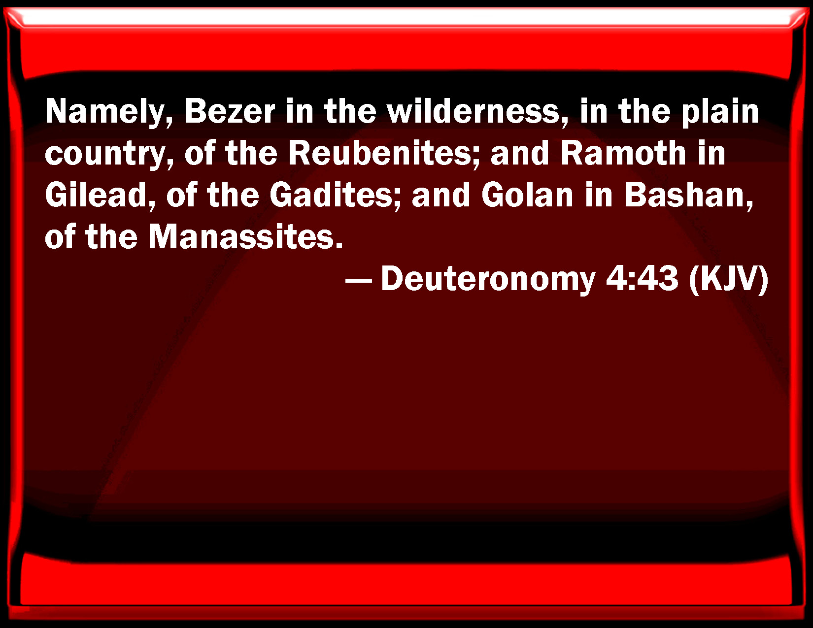 Bible Verse Slide Deuteronomy 4:43 Namely, Bezer in the wilderness, in the plain country, of the Reubenites; and Ramoth in Gilead, of the Gadites; and Golan in Bashan, of the Manassites. KJV: Namely, Bezer in the wilderness, in the plain country, of the Reubenites; and Ramoth in Gilead, of the Gadites; and Golan in Bashan, of the Manassites. DRB: Bosor in the wilderness, which is situate in the plains of the tribe of Ruben: and Ramoth in Galaad, which is in the tribe of Gad: and Golan in Basan, which is in the tribe of Manasses. DBT: Bezer in the wilderness, in the plateau, of the Reubenites, and Ramoth in Gilead, of the Gadites, and Golan in Bashan, of the Manassites. ERV: namely, Bezer in the wilderness, in the plain country, for the Reubenites; and Ramoth in Gilead, for the Gadites; and Golan in Bashan, for the Manassites. WBT: Namely, Bezer in the wilderness, in the plain country, of the Reubenites; and Ramoth in Gilead, of the Gadites; and Golan in Bashan, of the Manassites. WEB: [namely], Bezer in the wilderness, in the plain country, for the Reubenites; and Ramoth in Gilead, for the Gadites; and Golan in Bashan, for the Manassites. YLT: Bezer, in the wilderness, in the land of the plain, of the Reubenite; and Ramoth, in Gilead, of the Gadite; and Golan, in Bashan, of the Manassahite.Links Deuteronomy 4:43 NIV • Deuteronomy 4:43 NLT • Deuteronomy 4:43 ESV • Deuteronomy 4:43 NASB • Deuteronomy 4:43 KJV • Deuteronomy 4:43 Interlinear • Deuteronomy 4:43 Commentaries • Deuteronomy 4:43 Parallel Texts • Deuteronomy 4:43 Bible Apps • Deuteronomy 4:43 Parallel • Bible Hub |