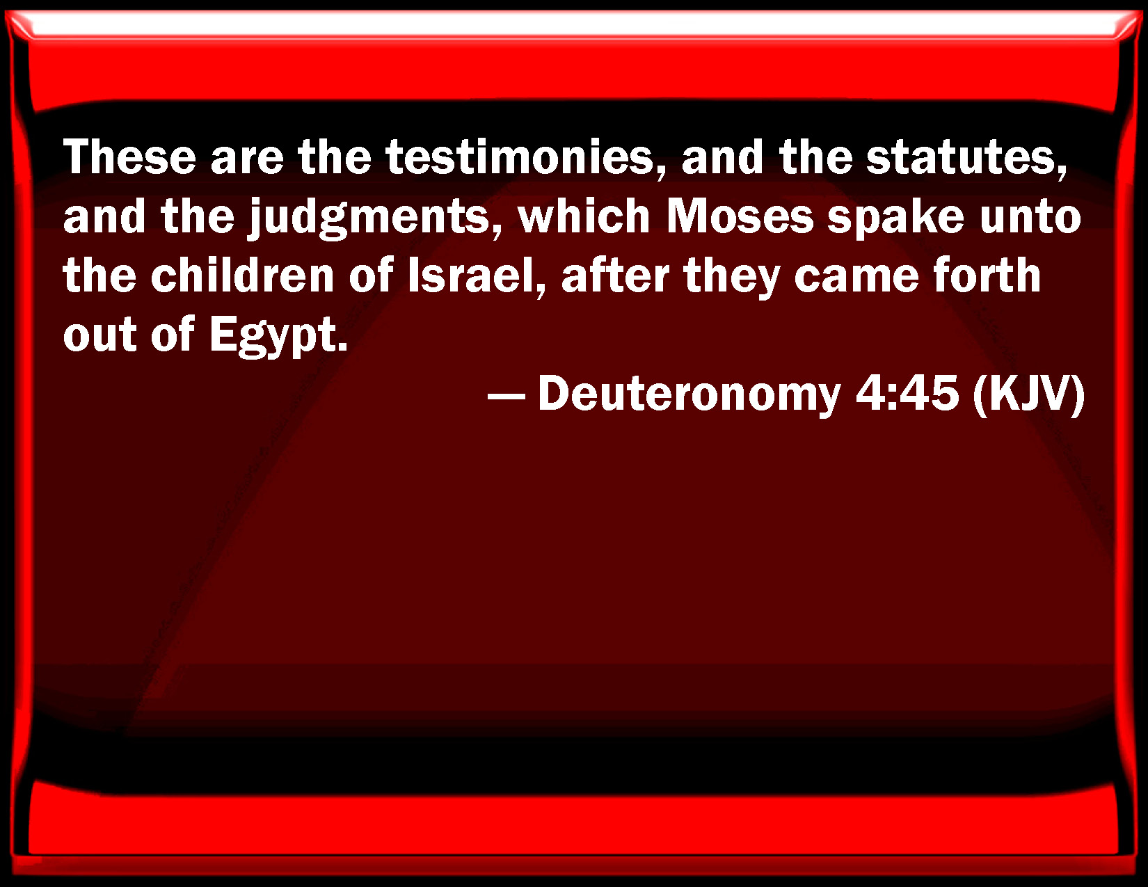 Bible Verse Slide Deuteronomy 4:45 These are the testimonies, and the statutes, and the judgments, which Moses spoke to the children of Israel, after they came forth out of Egypt. KJV: These are the testimonies, and the statutes, and the judgments, which Moses spake unto the children of Israel, after they came forth out of Egypt, DRB: And these are the testimonies and ceremonies and judgments, which he spoke to the children of Israel, when they came out of Egypt, DBT: these are the testimonies, and the statutes, and the ordinances that Moses declared to the children of Israel, when they came out of Egypt, ERV: these are the testimonies, and the statutes, and the judgments, which Moses spake unto the children of Israel, when they came forth out of Egypt; WBT: These are the testimonies, and the statutes, and the judgments, which Moses spoke to the children of Israel, after they came forth from Egypt, WEB: these are the testimonies, and the statutes, and the ordinances, which Moses spoke to the children of Israel, when they came forth out of Egypt, YLT: these are the testimonies, and the statutes, and the judgments, which Moses hath spoken unto the sons of Israel, in their coming out of Egypt,Links Deuteronomy 4:45 NIV • Deuteronomy 4:45 NLT • Deuteronomy 4:45 ESV • Deuteronomy 4:45 NASB • Deuteronomy 4:45 KJV • Deuteronomy 4:45 Interlinear • Deuteronomy 4:45 Commentaries • Deuteronomy 4:45 Parallel Texts • Deuteronomy 4:45 Bible Apps • Deuteronomy 4:45 Parallel • Bible Hub |