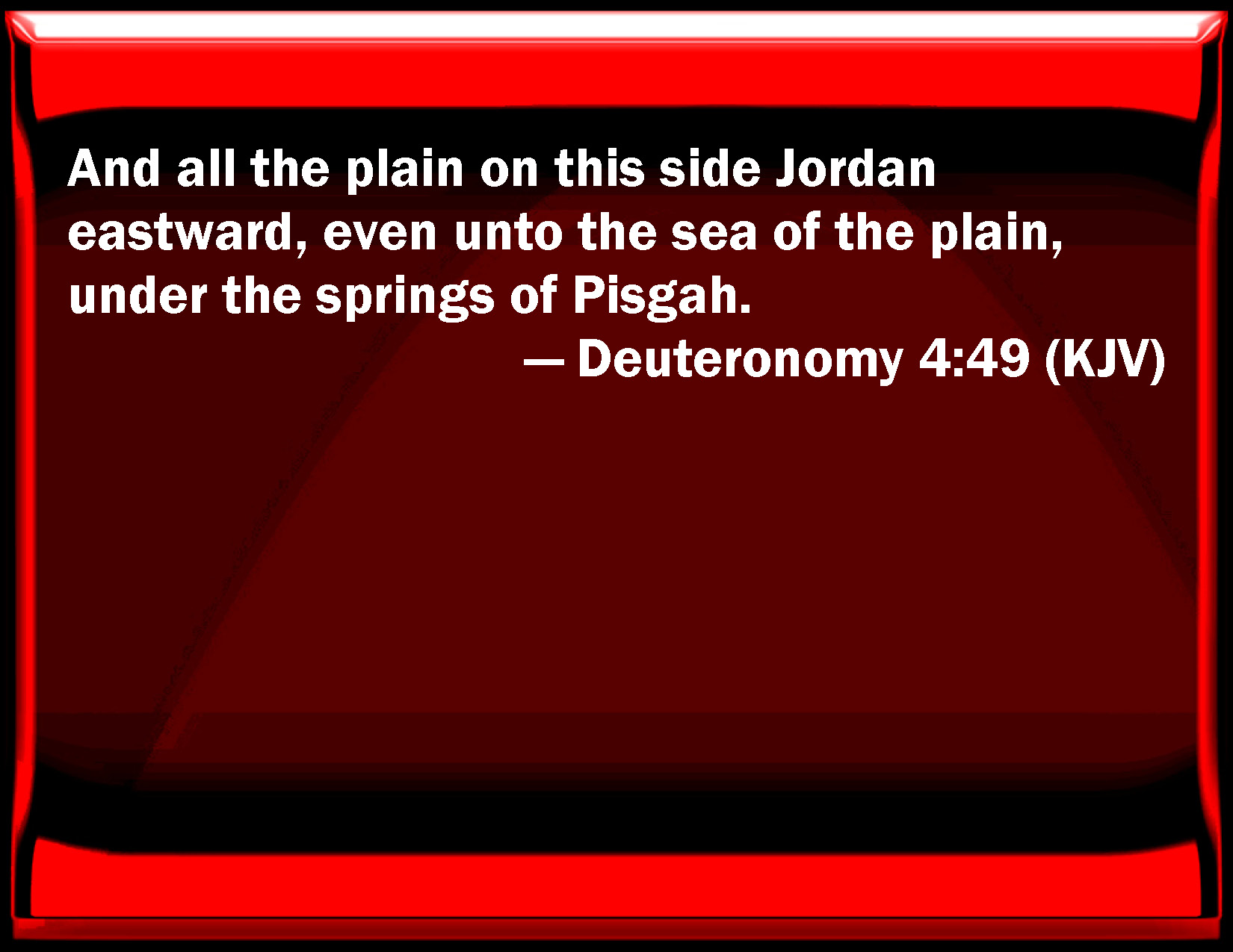 Bible Verse Slide Deuteronomy 4:49 And all the plain on this side Jordan eastward, even to the sea of the plain, under the springs of Pisgah. KJV: And all the plain on this side Jordan eastward, even unto the sea of the plain, under the springs of Pisgah. DRB: All the plain beyond the Jordan at the east side, unto the see of the wilderness, and unto the foot of mount Phasga. DBT: and all the plain on this side the Jordan, eastward, and as far as the sea of the plain, under the slopes of Pisgah. ERV: and all the Arabah beyond Jordan eastward, even unto the sea of the Arabah, under the slopes of Pisgah. WBT: And all the plain on the side of Jordan eastward, even to the sea of the plain, under the springs of Pisgah. WEB: and all the Arabah beyond the Jordan eastward, even to the sea of the Arabah, under the slopes of Pisgah. YLT: and all the plain beyond the Jordan eastward, even unto the sea of the plain, under the springs of Pisgah.Links Deuteronomy 4:49 NIV • Deuteronomy 4:49 NLT • Deuteronomy 4:49 ESV • Deuteronomy 4:49 NASB • Deuteronomy 4:49 KJV • Deuteronomy 4:49 Interlinear • Deuteronomy 4:49 Commentaries • Deuteronomy 4:49 Parallel Texts • Deuteronomy 4:49 Bible Apps • Deuteronomy 4:49 Parallel • Bible Hub |