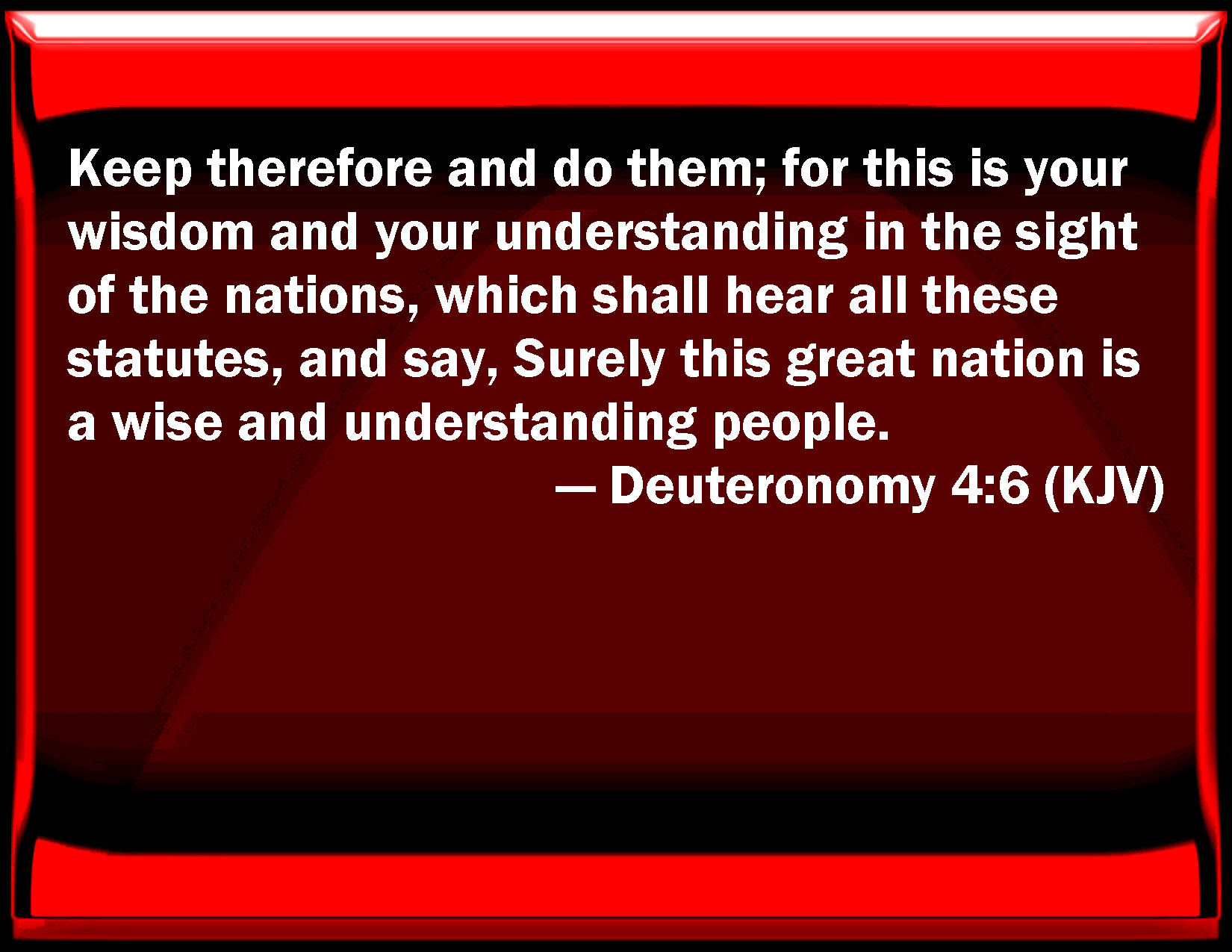 Bible Verse Slide Deuteronomy 4:6 Keep therefore and do them; for this is your wisdom and your understanding in the sight of the nations, which shall hear all these statutes, and say, Surely this great nation is a wise and understanding people. KJV: Keep therefore and do them; for this is your wisdom and your understanding in the sight of the nations, which shall hear all these statutes, and say, Surely this great nation is a wise and understanding people. DRB: And you shall observe, and fulfil them in practice. For this is your wisdom, and understanding in the sight of nations, that hearing all these precepts, they may say: Behold a wise and understanding people, a great nation. DBT: And ye shall keep and do them; for that will be your wisdom and your understanding before the eyes of the peoples that shall hear all these statutes, and say, Verily this great nation is a wise and understanding people. ERV: Keep therefore and do them; for this is your wisdom and your understanding in the sight of the peoples, which shall hear all these statutes, and say, Surely this great nation is a wise and understanding people. WBT: Keep therefore and do them; for this is your wisdom and your understanding in the sight of the nations, which will hear all these statutes, and say, Surely this great nation is a wise and understanding people. WEB: Keep therefore and do them; for this is your wisdom and your understanding in the sight of the peoples, who shall hear all these statutes, and say, "Surely this great nation is a wise and understanding people." YLT: and ye have kept and done them (for it is your wisdom and your understanding) before the eyes of the peoples who hear all these statutes, and they have said, Only, a people wise and understanding is this great nation.Links Deuteronomy 4:6 NIV • Deuteronomy 4:6 NLT • Deuteronomy 4:6 ESV • Deuteronomy 4:6 NASB • Deuteronomy 4:6 KJV • Deuteronomy 4:6 Interlinear • Deuteronomy 4:6 Commentaries • Deuteronomy 4:6 Parallel Texts • Deuteronomy 4:6 Bible Apps • Deuteronomy 4:6 Parallel • Bible Hub |