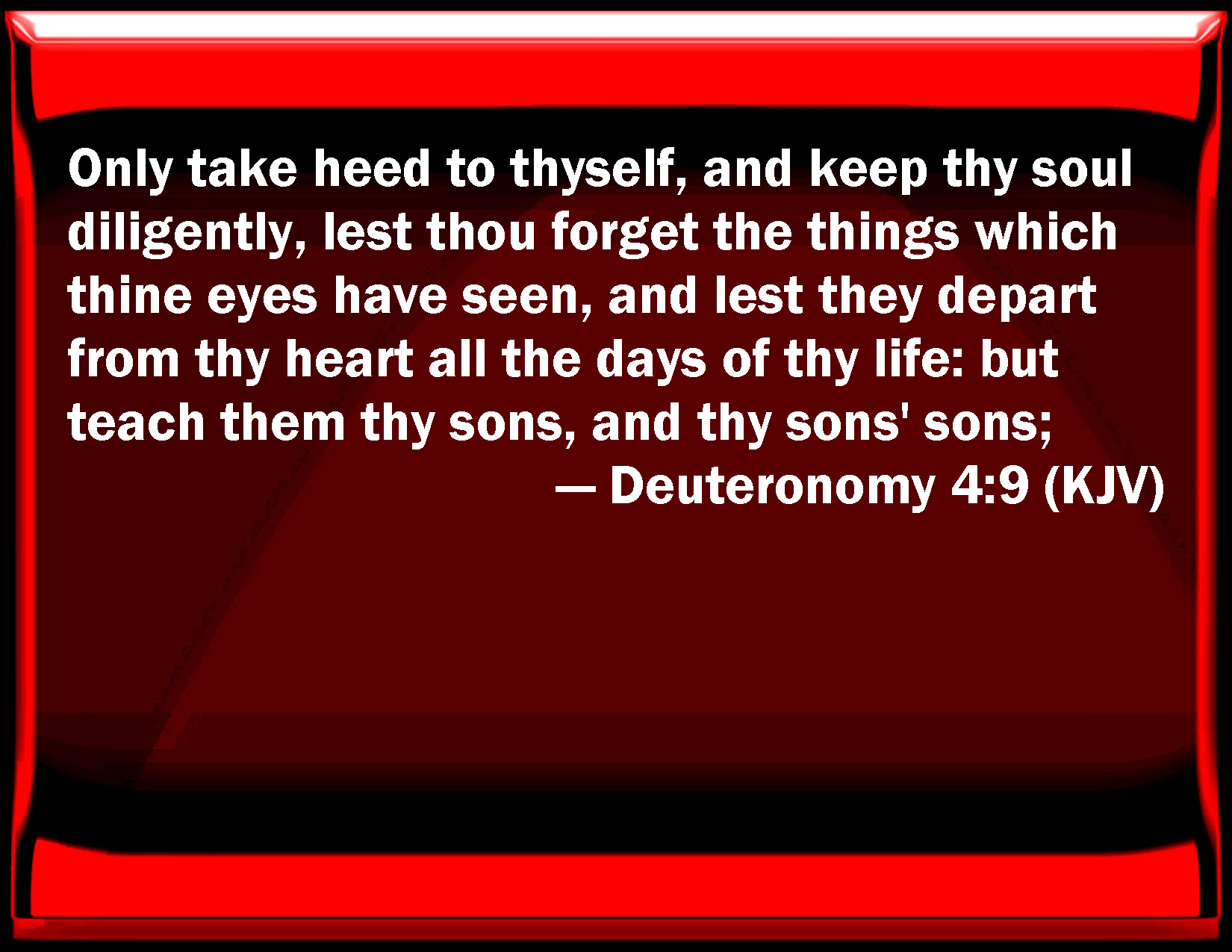 Bible Verse Slide Deuteronomy 4:9 Only take heed to yourself, and keep your soul diligently, lest you forget the things which your eyes have seen, and lest they depart from your heart all the days of your life: but teach them your sons, and your sons' sons; KJV: Only take heed to thyself, and keep thy soul diligently, lest thou forget the things which thine eyes have seen, and lest they depart from thy heart all the days of thy life: but teach them thy sons, and thy sons' sons; DRB: Keep thyself therefore, and thy soul carefully. Forget not the words that thy eyes have seen, and let them not go out of thy heart all the days of thy life. Thou shalt teach them to thy sons and to thy grandsons, DBT: Only take heed to thyself, and keep thy soul diligently, lest thou forget the things that thine eyes have seen (and lest they depart from thy heart all the days of thy life; but thou shalt make them known to thy sons and to thy sons' sons), ERV: Only take heed to thyself, and keep thy soul diligently, lest thou forget the things which thine eyes saw, and lest they depart from thy heart all the days of thy life; but make them known unto thy children and thy children's children; WBT: Only take heed to thyself, and keep thy soul diligently, lest thou shouldst forget the things which thy eyes have seen, and lest they depart from thy heart all the days of thy life: but teach them to thy sons, and thy sons' sons: WEB: Only take heed to yourself, and keep your soul diligently, lest you forget the things which your eyes saw, and lest they depart from your heart all the days of your life; but make them known to your children and your children's children; YLT: 'Only, take heed to thyself, and watch thy soul exceedingly, lest thou forget the things which thine eyes have seen, and lest they turn aside from thy heart, all days of thy life; and thou hast made them known to thy sons, and to thy sons' sons.Links Deuteronomy 4:9 NIV • Deuteronomy 4:9 NLT • Deuteronomy 4:9 ESV • Deuteronomy 4:9 NASB • Deuteronomy 4:9 KJV • Deuteronomy 4:9 Interlinear • Deuteronomy 4:9 Commentaries • Deuteronomy 4:9 Parallel Texts • Deuteronomy 4:9 Bible Apps • Deuteronomy 4:9 Parallel • Bible Hub |